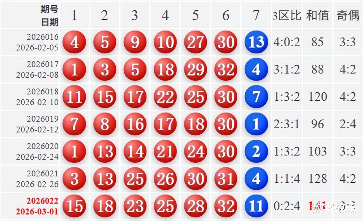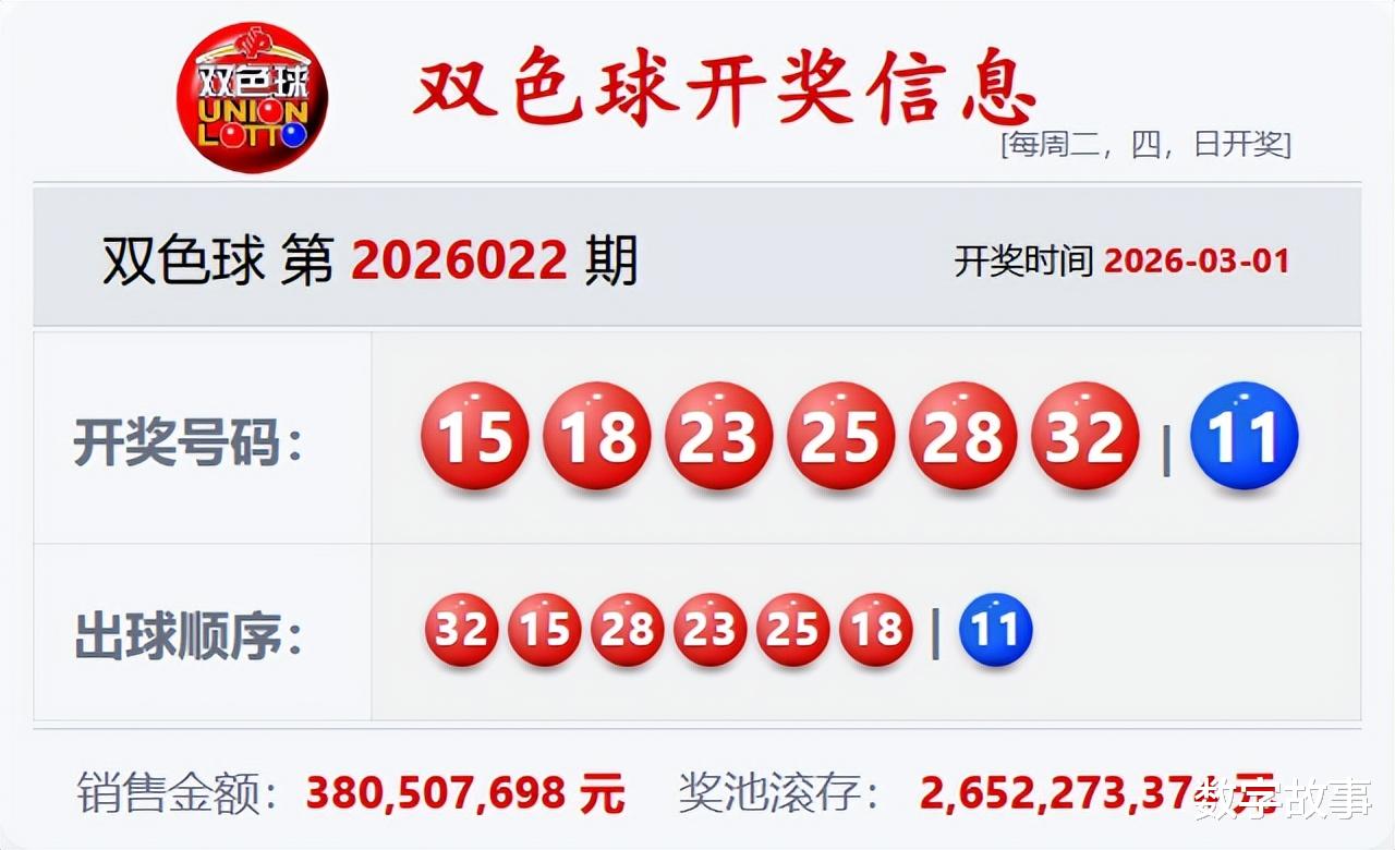 文末有双色球红球等差数18-25-32, 18-23-28的历史统计。【福彩双色球26022期开奖结果及统计】红球号和值141,蓝球11,6注一等奖,奖池26.52亿(2652273374)。双色球26022期开奖结果及中奖情况:出奖时间: 2026-03-01 星期日 红球: 15-18-23-25-28-32蓝球: 11双色球红球重号叠码:25红球奇偶比:3:3红球和值:141红球跨度:17 三区比:0:2:4没有连号