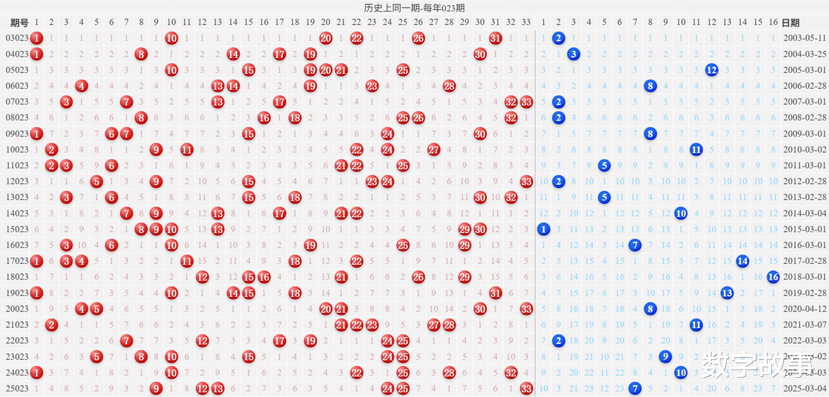 2) 历史同一期: 每年023期 (共23期)