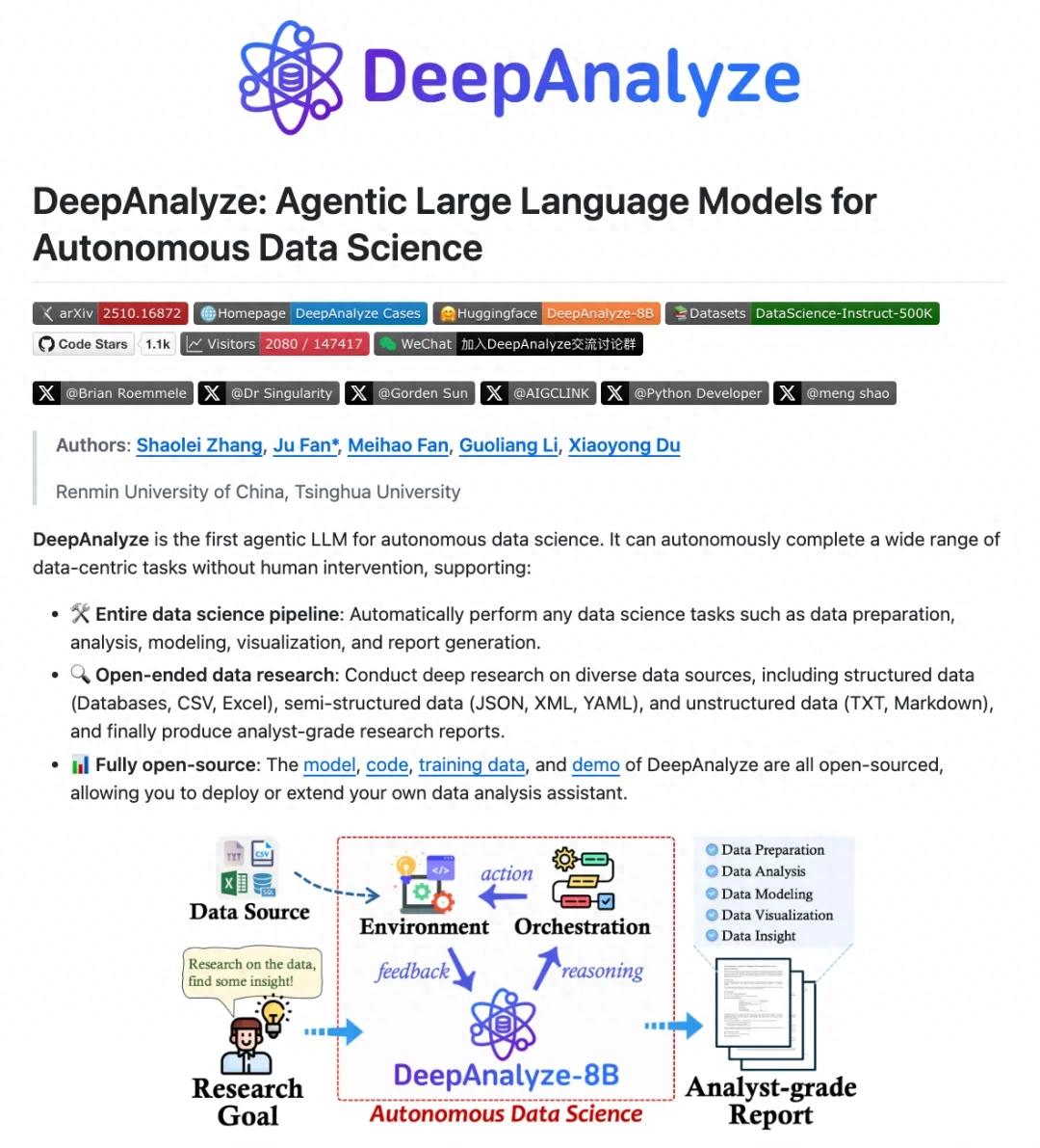 DeepAnalyze的论文、代码、模型、数据均已开源,收获1.1K+GitHub星标,欢迎大家体验!