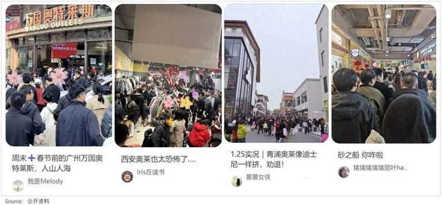 另一边,奥莱也几乎被挤成景区。广州万国奥莱限流入场,杭州百联“开门红”活动客流和日销双双刷新纪录,扬州砂之船入口排起长龙,高峰期要等两个小时才能进场……人们吐槽在奥莱抢货,堵得堪比逛5A景区。