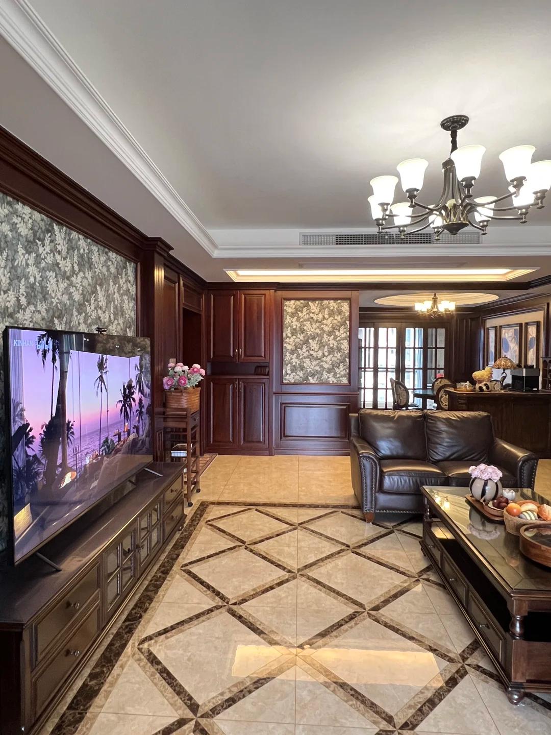 地面通铺米黄色瓷砖,将客厅、餐厅连接在一起,天花做了吊顶,并安装了大吊灯,虽然整体配色相对深,可是看起来不会觉得压抑;