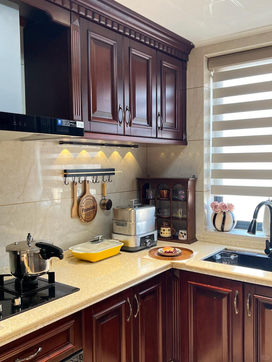 靠墙安装了一组U字型橱柜,柜门是红樱桃材质,台面是大理石的,将灶台、洗菜盆直接内嵌在里面,瓶瓶罐罐的调料品、小家电都放在边角,将台面尽量腾空,烹饪时才容易放开手脚。