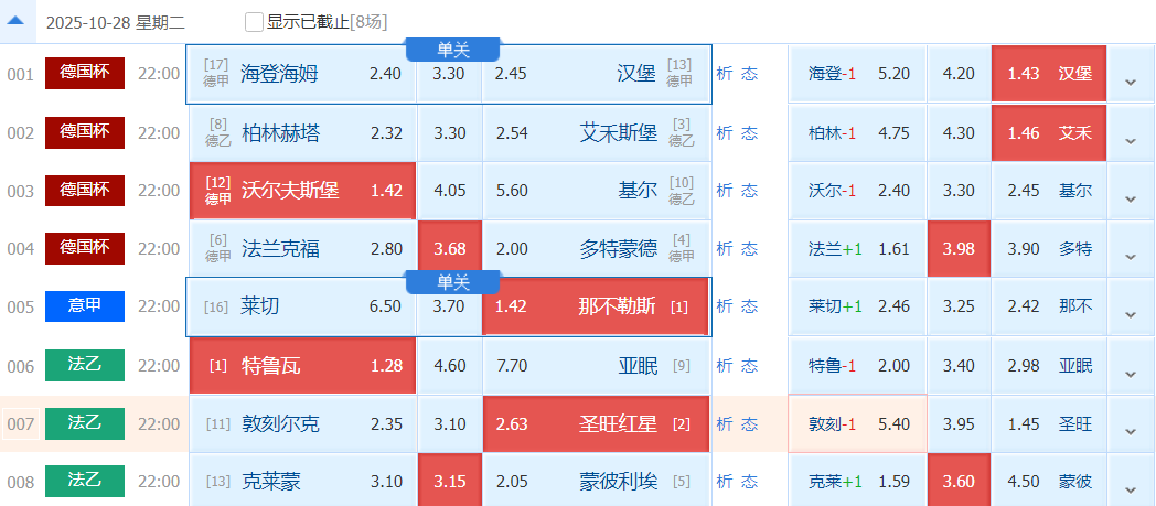 综合分析,海登海姆主场作战但伤病较多,近期防守漏洞明显,汉堡虽然状态一般但阵容更为齐整,且心理层面占优。杯赛赛制下,双方均有晋级动力,但汉堡客场不败概率更高,看好汉堡不败。