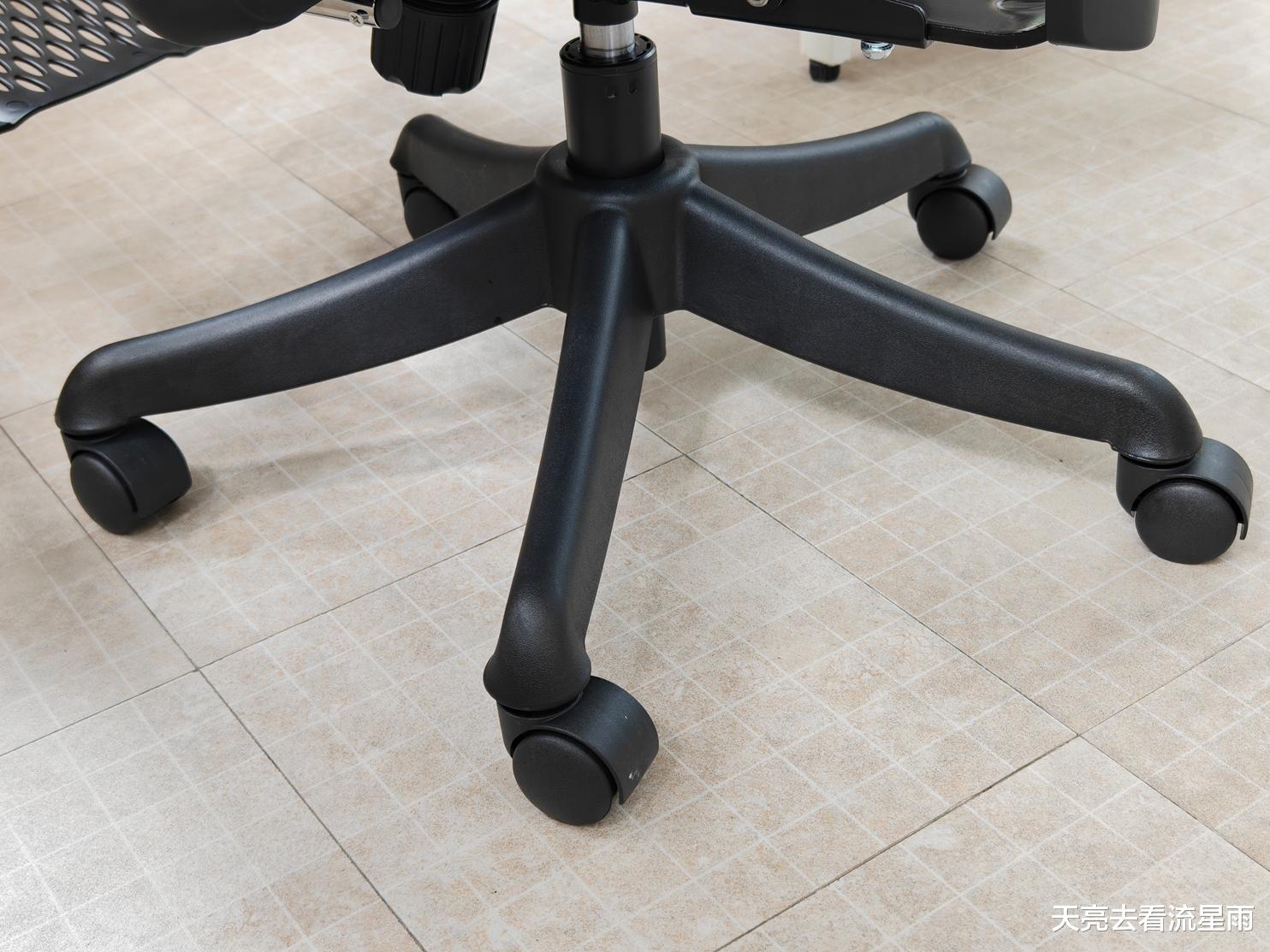 夏草木Fit2人体工学椅支脚采用五爪设计,可以承重200KG,像我老婆试躺总担心会翻倒的情况基本上不会出现的。底部轮子采用静音滚轮,能360°旋转,室内移动不用费力气搬,推着走就行。整个椅子也是可以360°旋转,久坐累了原地转转圈也是个不错的放松。