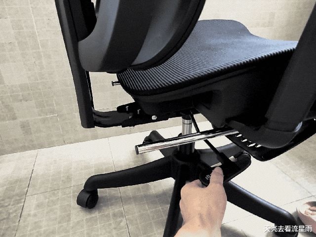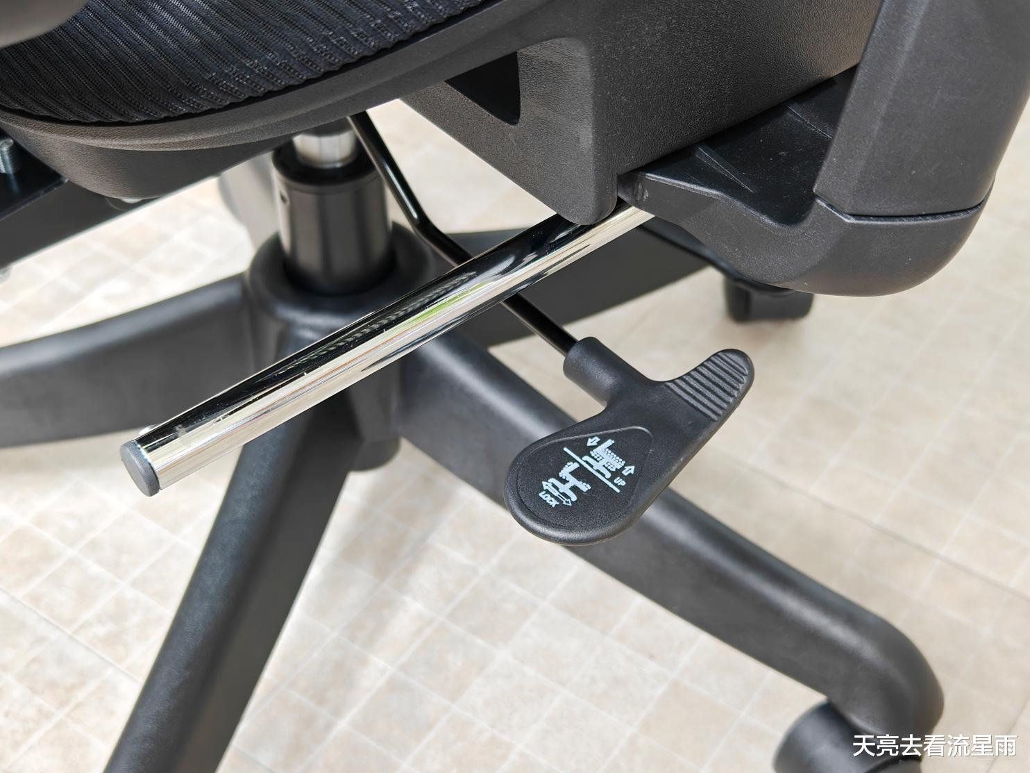 夏草木Fit2人体工学椅在底部区域设计了一个调节拨杆,上下调节椅子高度,拔出推进调节后仰角度,习惯了用起来还是简单方便的。