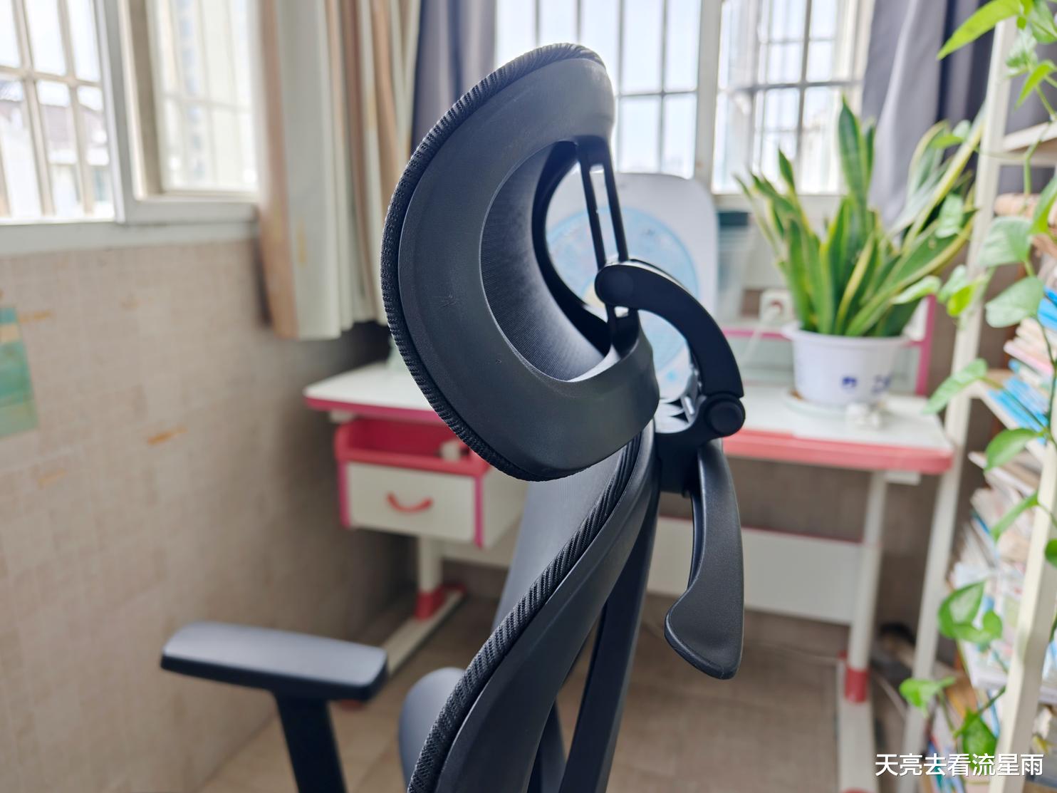 夏草木Fit2人体工学椅的头枕面积比较大且是弧形设计,这种设计的好处就是不管是坐是躺的时候左右转动头都能很好的呵护,让脖颈舒适。头枕可以升降调节和翻转调节以适应不同身高人群,家里三个不同身高的人分别坐了调试下都可以调到自己满意的角度。