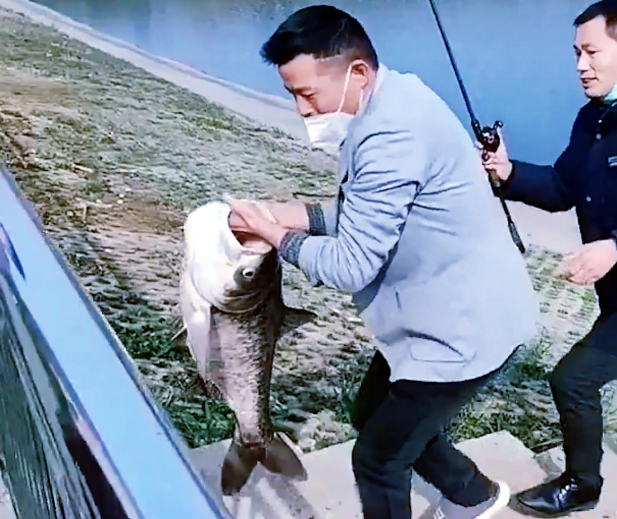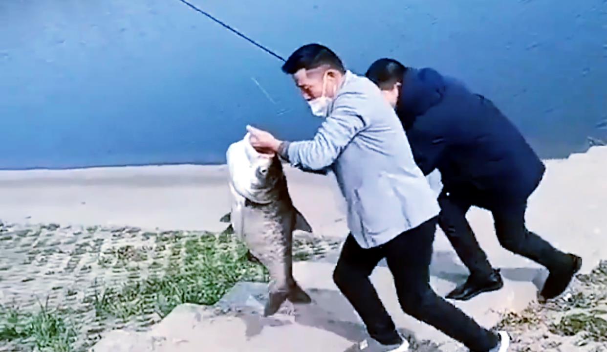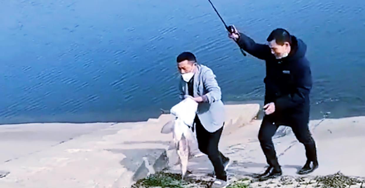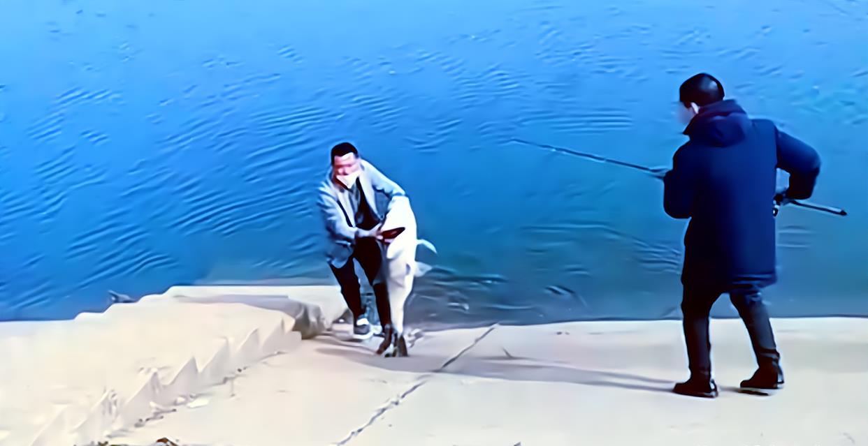 为了成功地将这条鱼拉上岸,俩人相互协作,一人手拿着鱼竿把鱼拉到水边,另外一人等候在水边,当它靠近时,眼疾手快地从鱼鳃处将其抓住,随后就快速地往岸上跑。