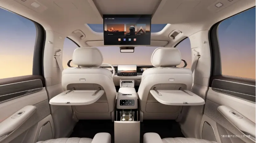 内饰延续唐L设计理念,但豪华感大幅提升。配备全液晶仪表、悬浮式中控、副驾娱乐屏组成的三屏系统,还有HUD抬头显示。方向盘更粗壮,车门改用电子按键开启。座椅采用2+2+2的6座布局,第二排为独立座椅,带一体式腿托、菱形缝线,支持一键躺平。二排还提供大尺寸折叠屏、小桌板和车载冰箱,第三排座椅也可电动调节并带加热功能。