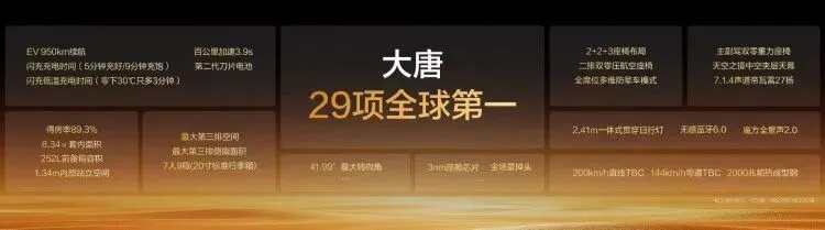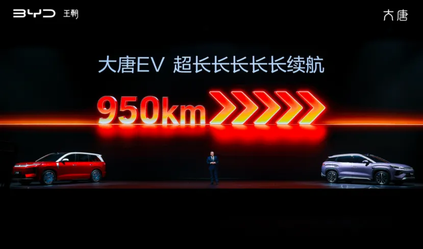 比亚迪大唐的核心亮点是第二代刀片电池。它能密度提高5%,支持兆瓦充电。大唐的后驱版本配备300千瓦(402马力)电动机,CLTC续航里程为950公里。这使该车型跻身续航最长的纯电动车跨界车名单。大唐四驱版本最大功率为585千瓦(784马力)。加速0到100公里/时间为3.9秒。据报道,该版本的续航里程为850公里。