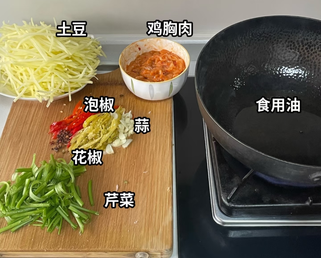 姐妹们!今天必须给你们安利这道 "米饭终结者" ——鸡胸肉泡椒土豆丝!说真的,我做完这道菜端上桌,电饭煲都得空一大半。鸡胸肉嫩到筷子夹不住,土豆丝脆爽咔滋响,泡椒那股子酸辣劲儿直往鼻子里钻,配上芹菜的清香,绝了!三碗米饭起步,减肥计划?明天再说吧!