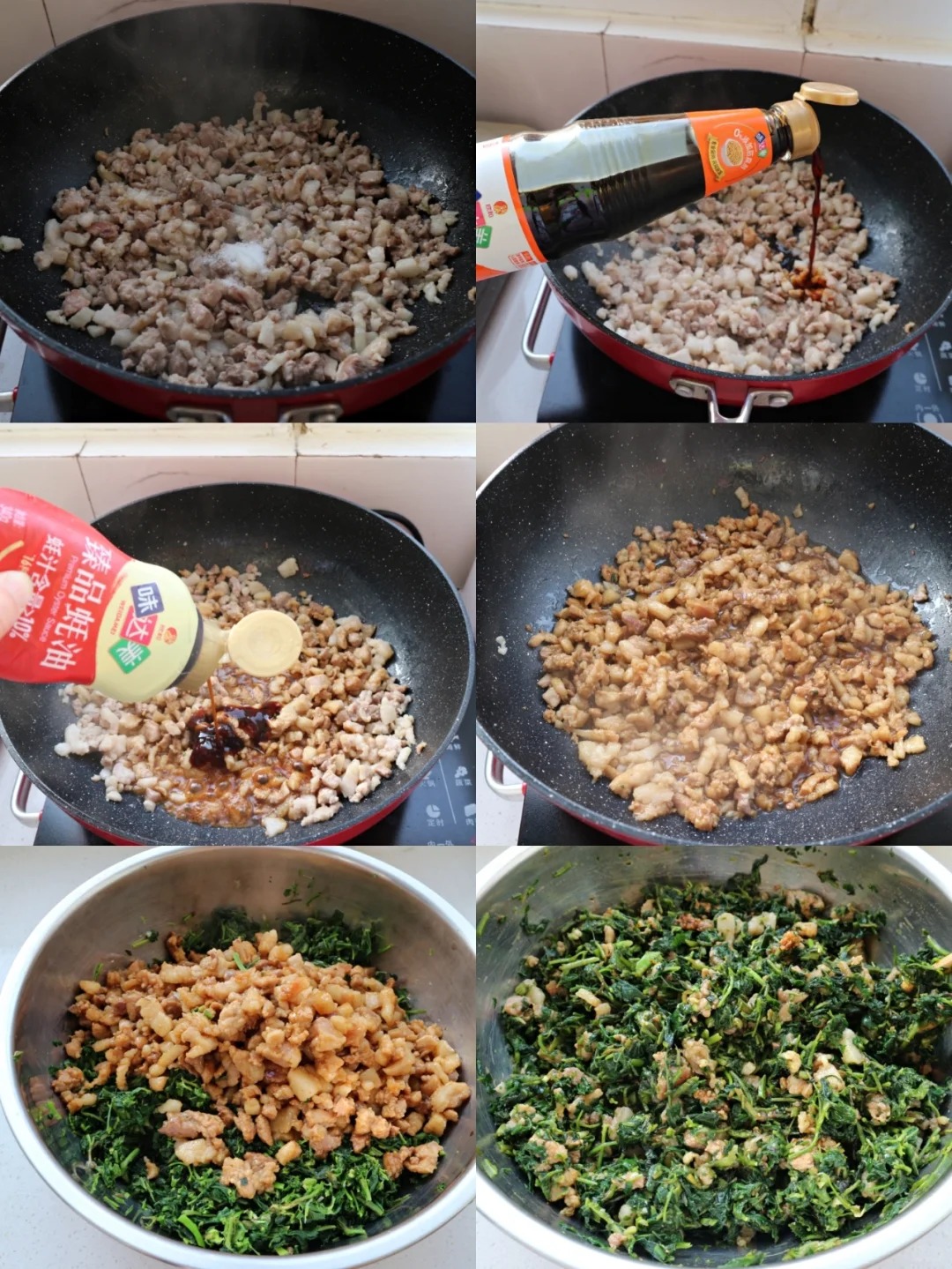 2️⃣空隙里来调馅,荠菜摘净开水焯水,去掉草酸,捞出后清洗几遍,在泡水一个小时。肥瘦相间的猪肉切成小块,再炖一下。放锅里炒熟,加一点点的盐,生抽,蚝油翻炒。
