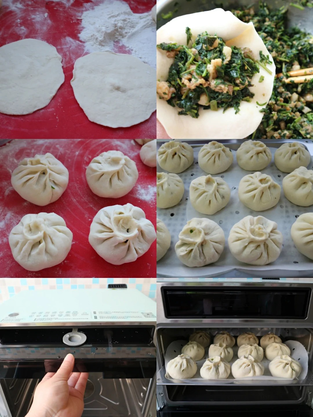 4️⃣面也醒发好了,揉几下排气,分成大剂子,擀薄,包上馅,捏着边依次捏着褶子包好,包子醒发20分钟,看到蓬松就好了,放入蒸盘中。