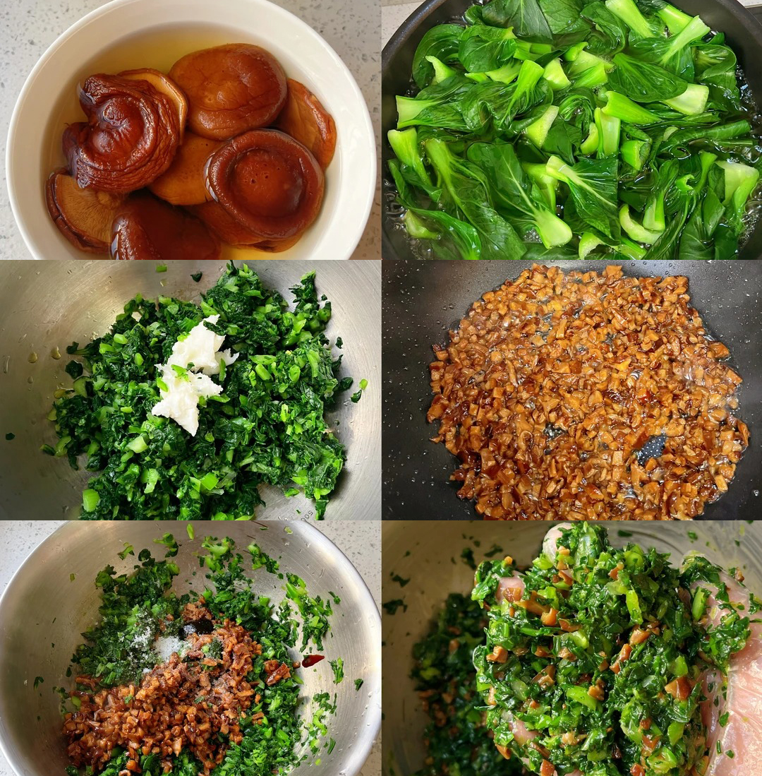 2️⃣800克青菜洗净,锅里放点油、盐、小苏打,水开放青菜30秒左右过冷水,多过几遍,捞出挤一下水分切碎,青菜碎放猪油拌均匀,下香菇丁、蚝油、盐、糖、一点白胡椒粉拌匀放入冰箱冷藏30分钟更好包;