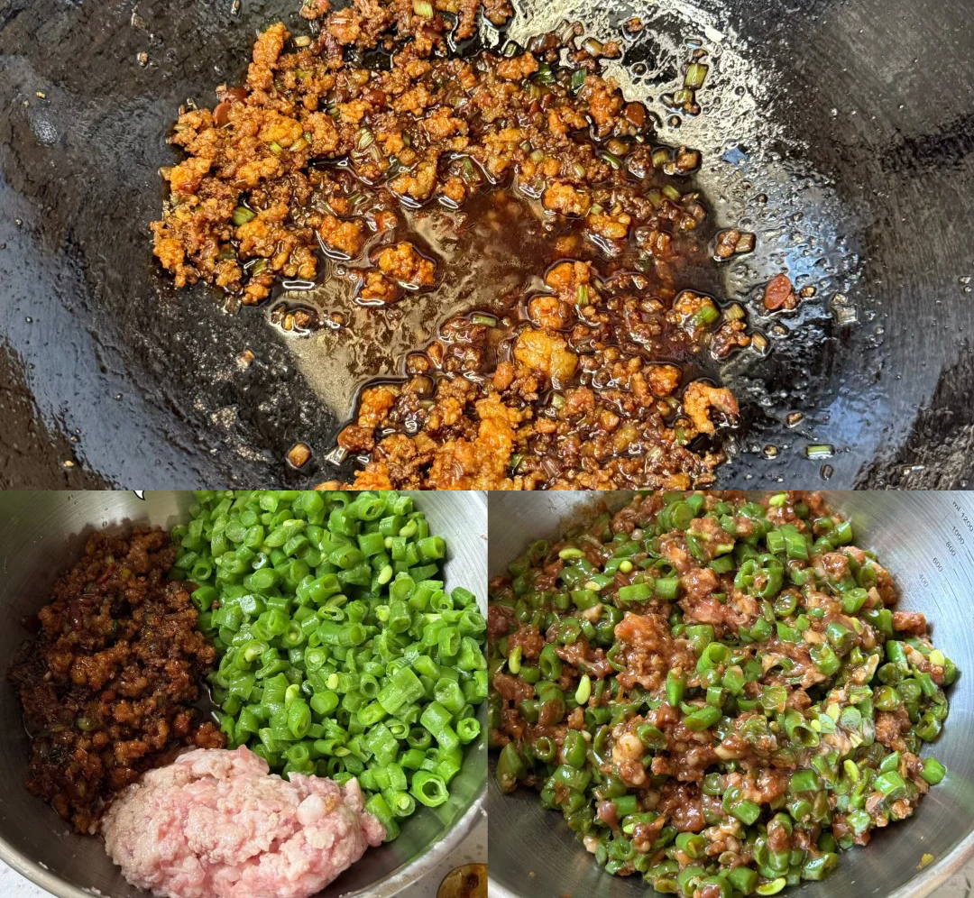 2️⃣先把一般肉沫炒一炒,加适量盐、鸡精、生抽、老抽、一勺黄豆酱、少量葱白、姜末,再把酱料炒香,然后跟剩下的肉沫、缸豆沫拌一起,冷藏备用;