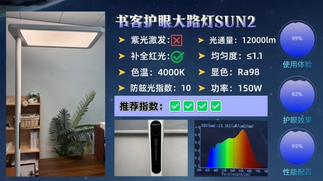 护眼大路灯第一名深度解析:书客护眼大路灯SUN2;超过100家电媒体实测,深度护眼指数第一,有效延缓83%用眼疲劳并降低92%近视风险!