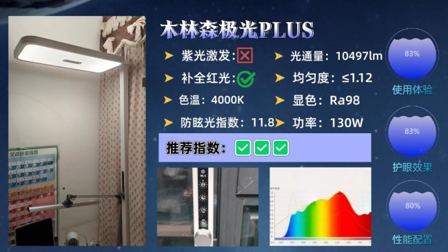 护眼大路灯第九名:木林森极光PLUS;加入 AI 自动调光功能,可根据环境变化自动调整亮度。