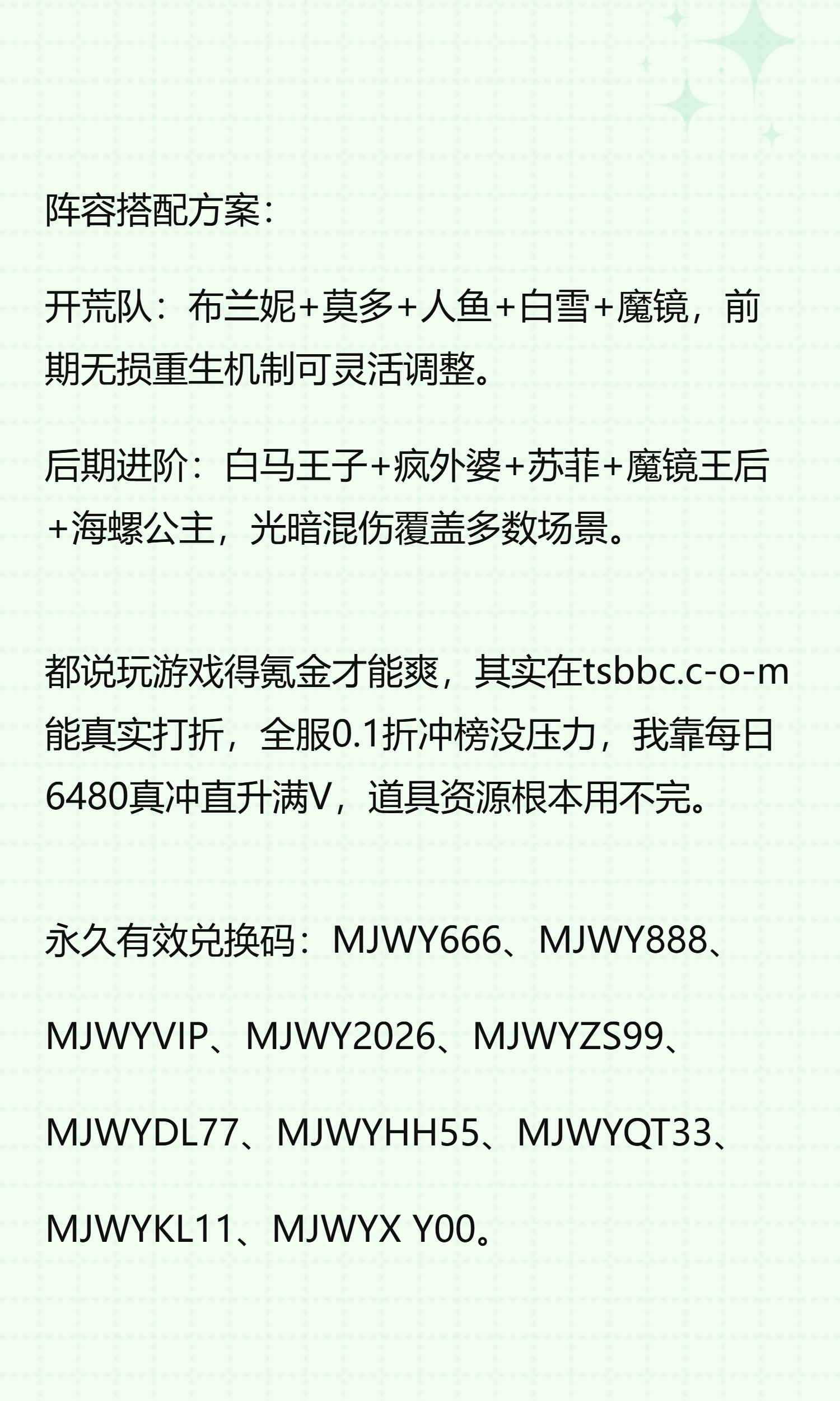T0必练:白马王子(光系爆发天花板)、疯外婆(暗系辅助,群体治疗+增益)、魔镜王后(全体AOE降防)、女仆苏菲(复活+群体治疗)。
