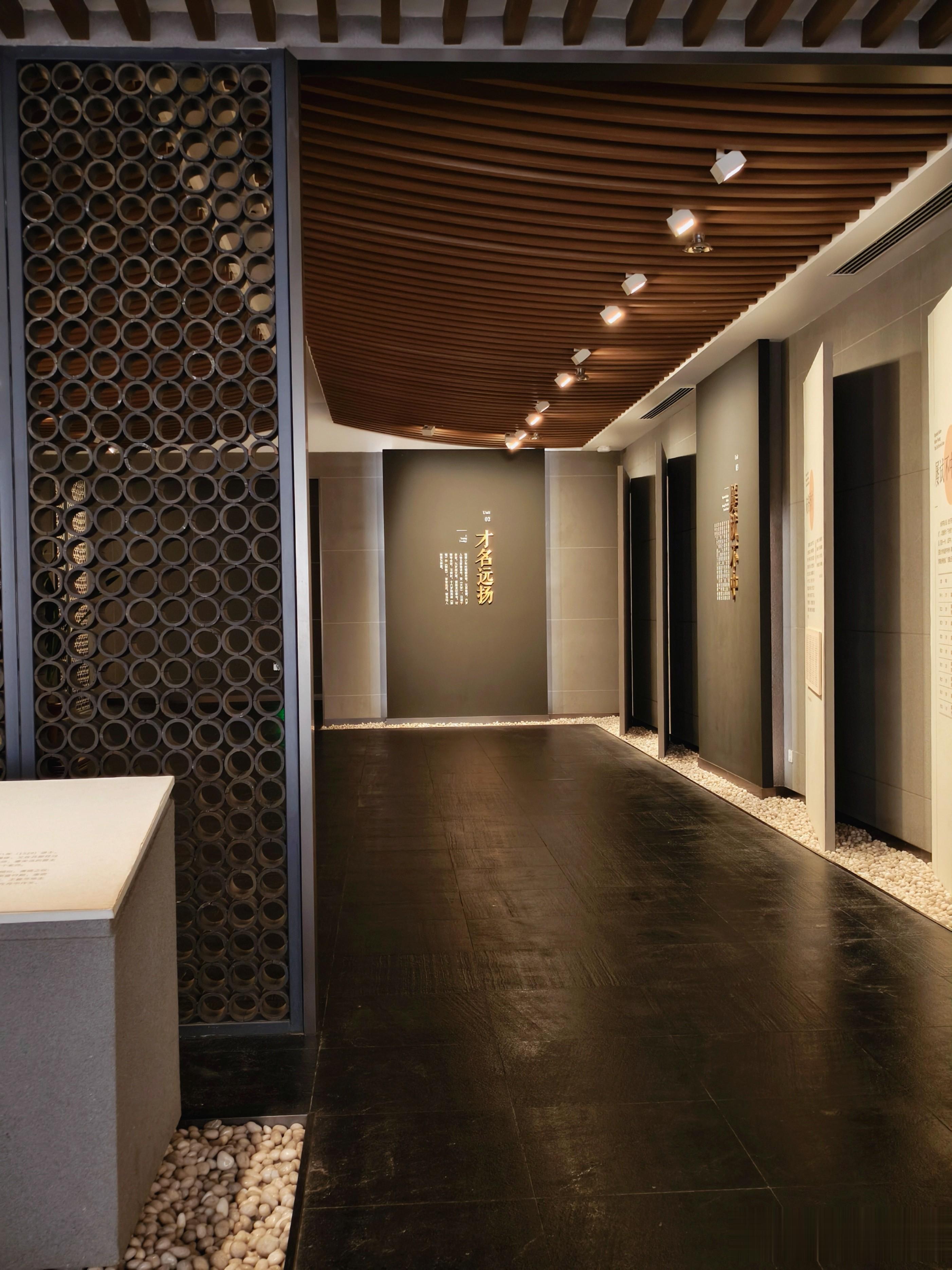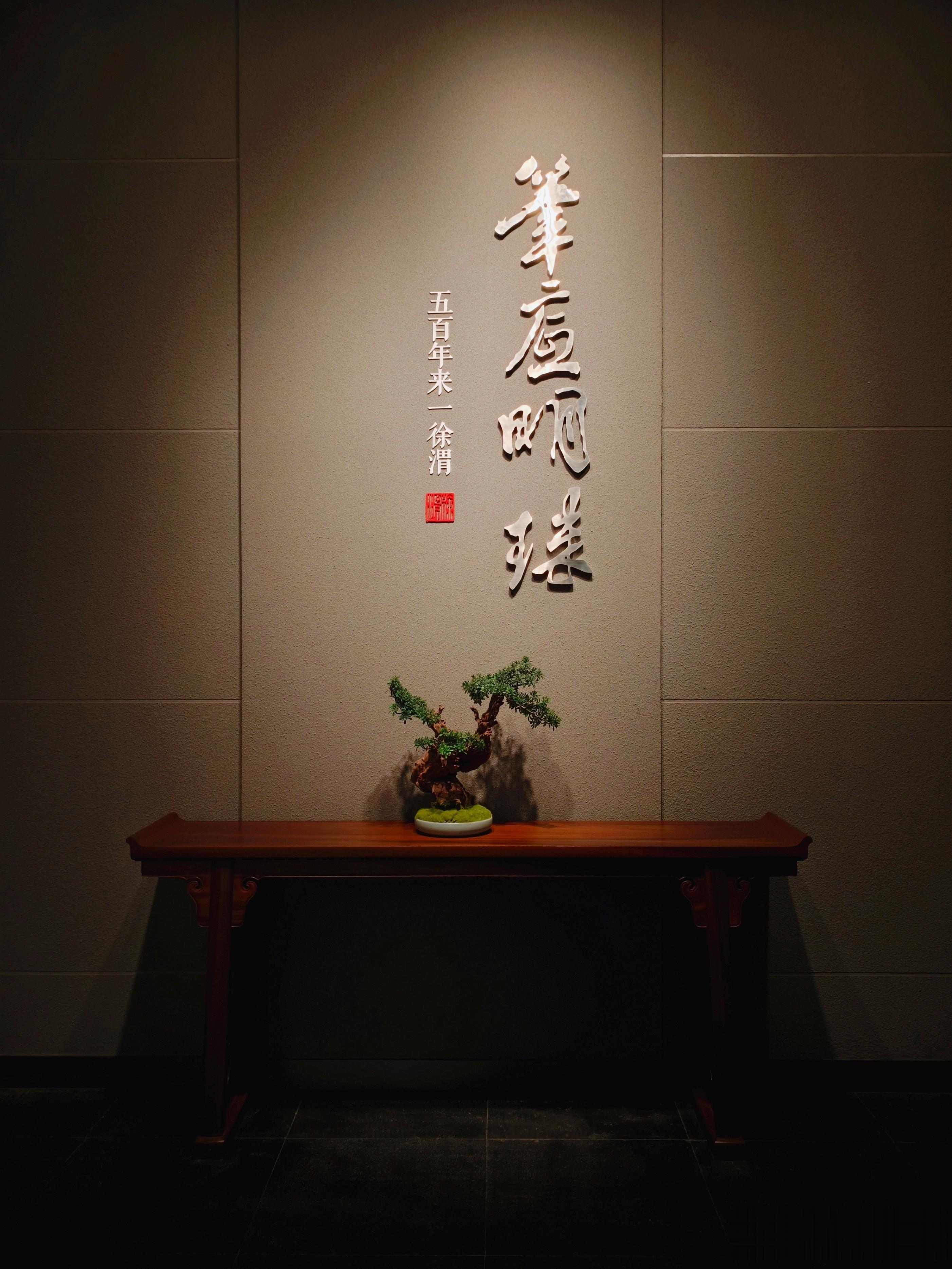 新建筑主体采用三折不等边人字坡掀角屋顶,勾勒出简约的中式基调,再辅以石材、金属、玻璃等现代元素,营造出水墨画般的写意之境,完美契合徐渭之画作风格。