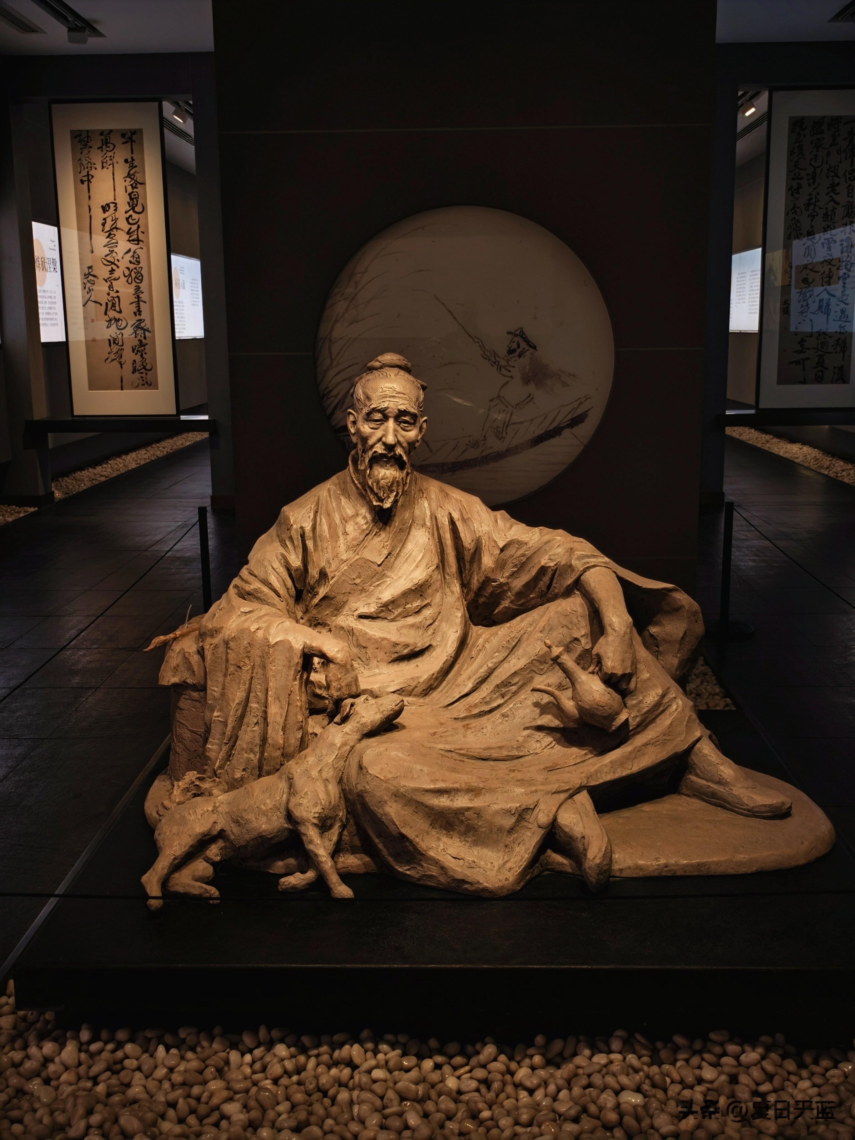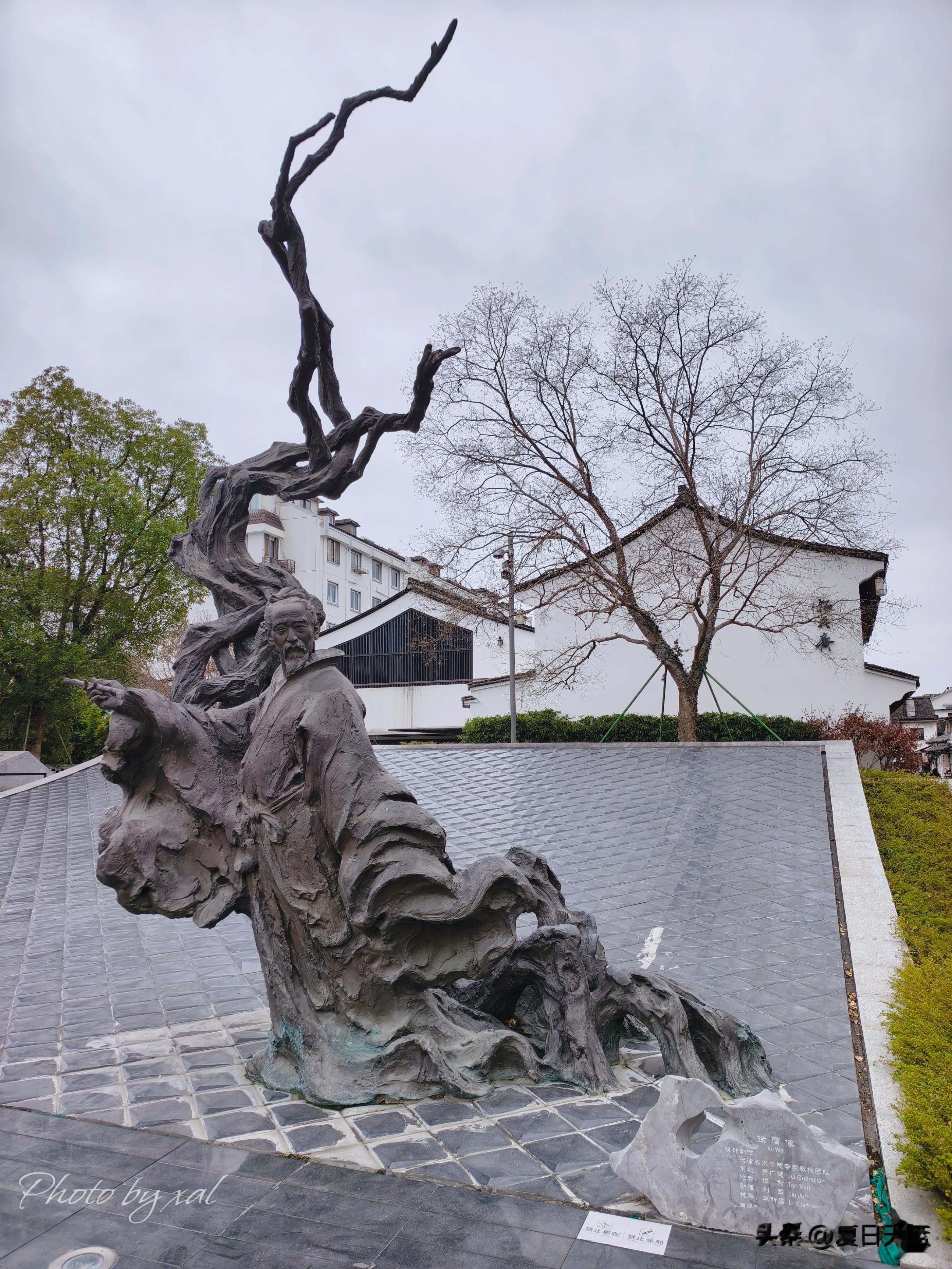 在艺术馆前广场上,还有一座青铜雕塑。远观好似根雕,走近一看,却是徐渭像。这是一件极富神韵的佳作。创作者匠心独运,以曲屈遒劲的青藤为背景,年逾花甲的徐渭立于藤前,一手执笔一手拂袖,眉目微蹙,凝神思索,面带沧桑但绝无落魄。其宽袍大袖的皱褶,已与身后青藤融为一体,象征着徐渭如青藤般坚韧顽强、恣意生长的内在精神。青藤即徐渭,徐渭即青藤。
