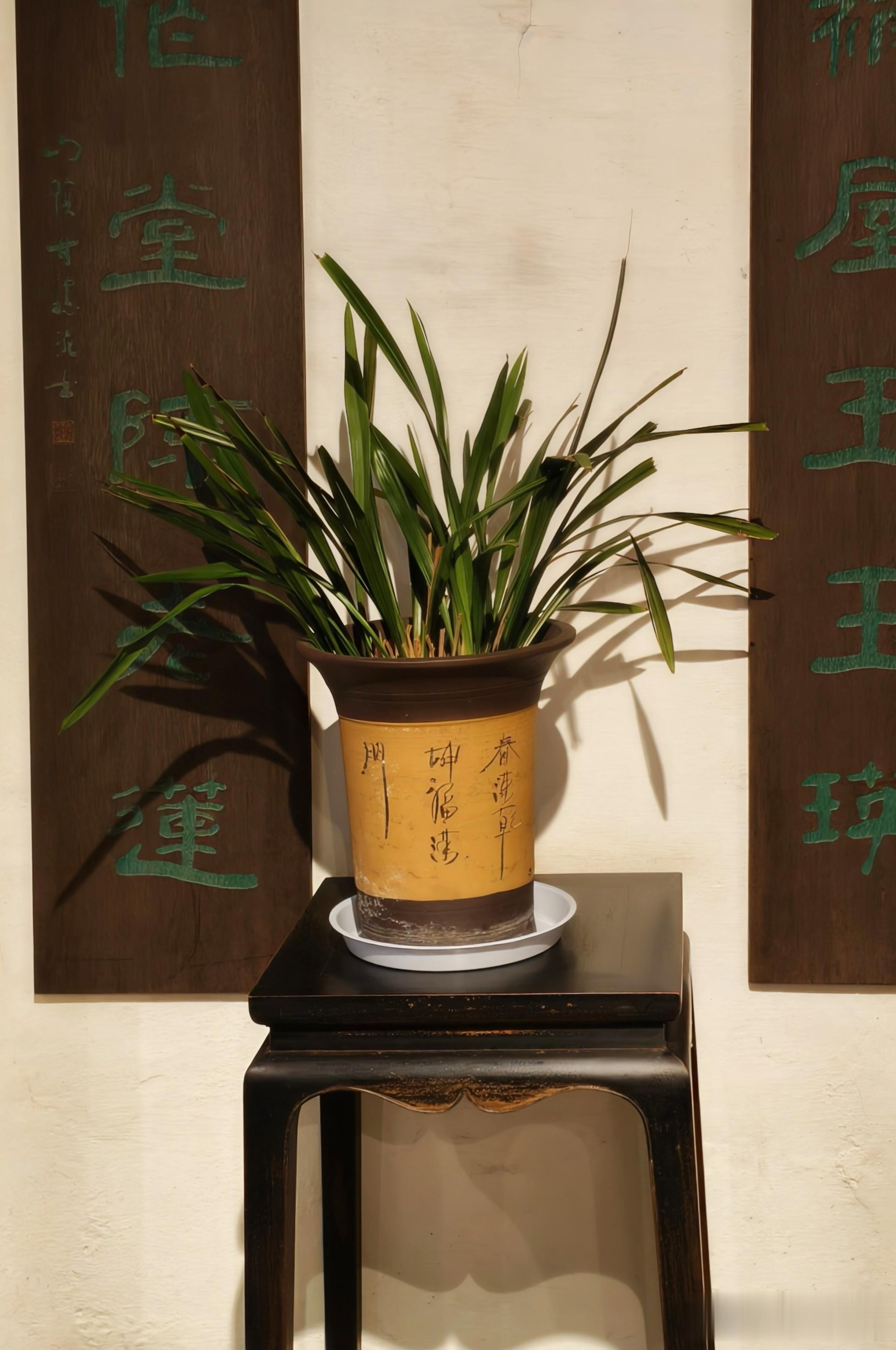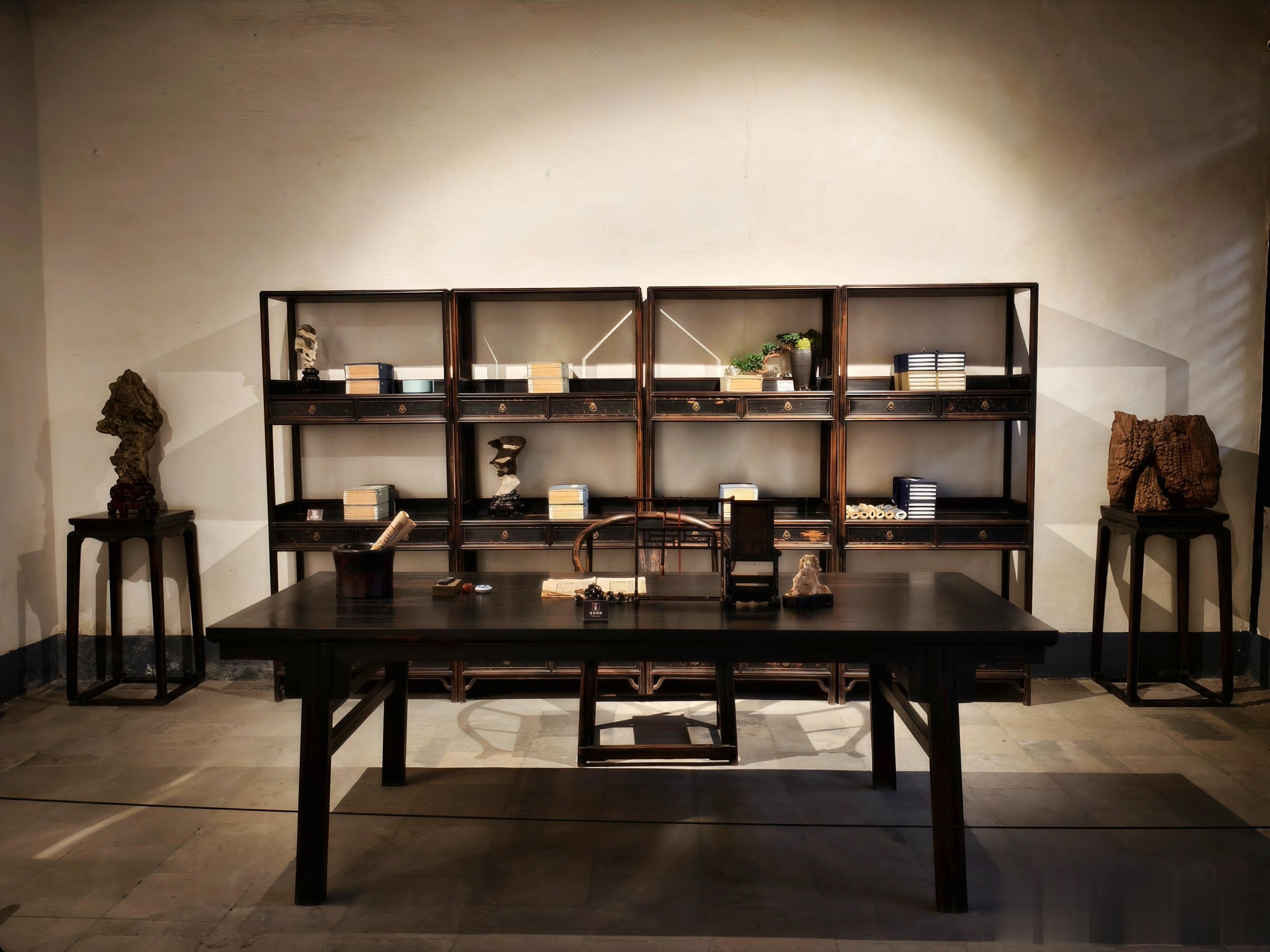 正屋分两室,设桌椅、书架、案几。桌上摆着文房四宝,几上放着盆景绿植,墙上挂着楹联字画,整体布局古朴雅致。