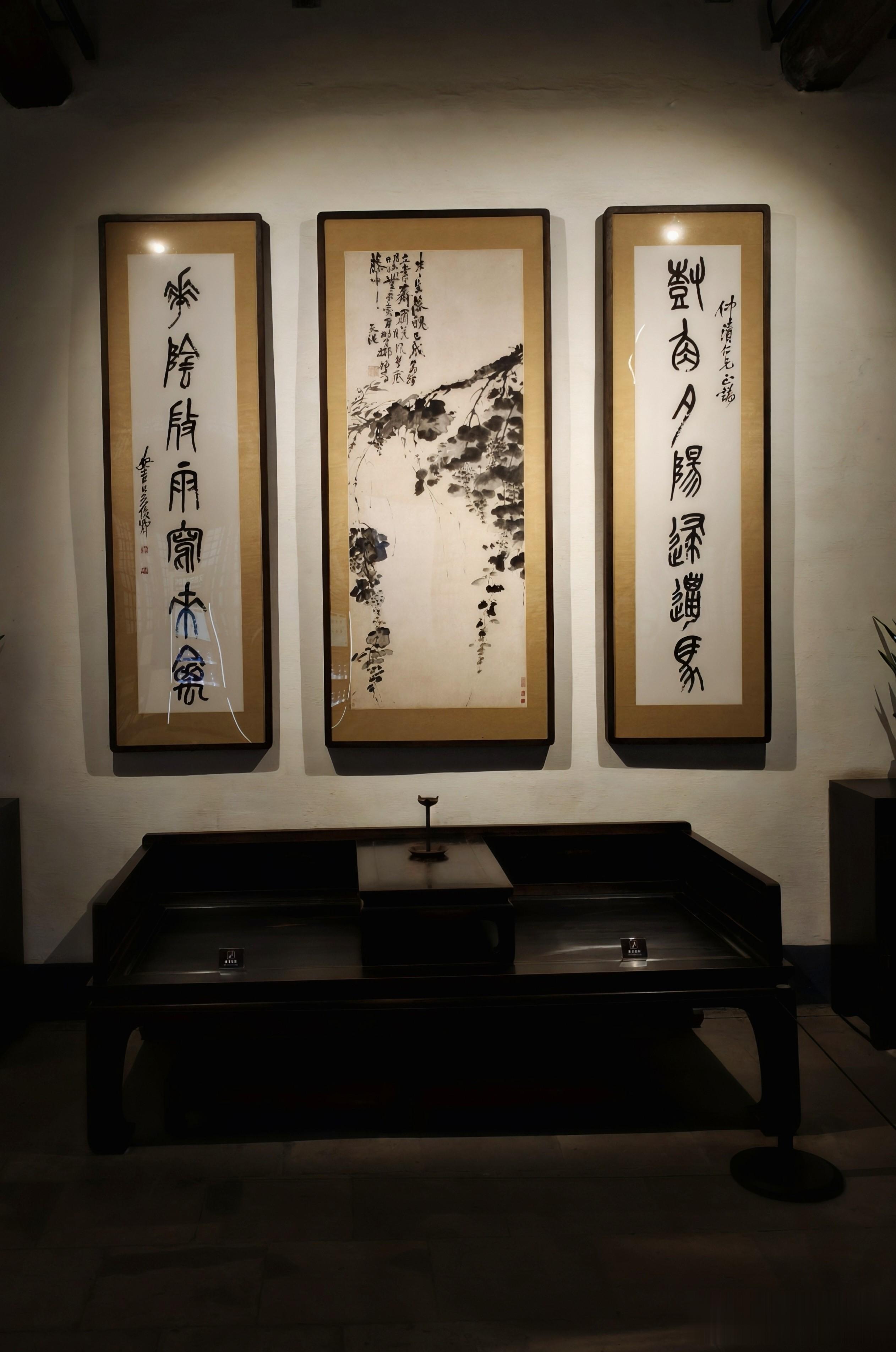 转到书屋后室,这里展示了徐渭与白鹇、徐渭与茶、徐渭与戏曲、徐渭与酒、徐渭与琴五个生活场景。以《葡萄图》、《黄甲图》等徐渭名作复制品和文字介绍相结合的形式,引导游人深入探索徐渭的艺术世界。