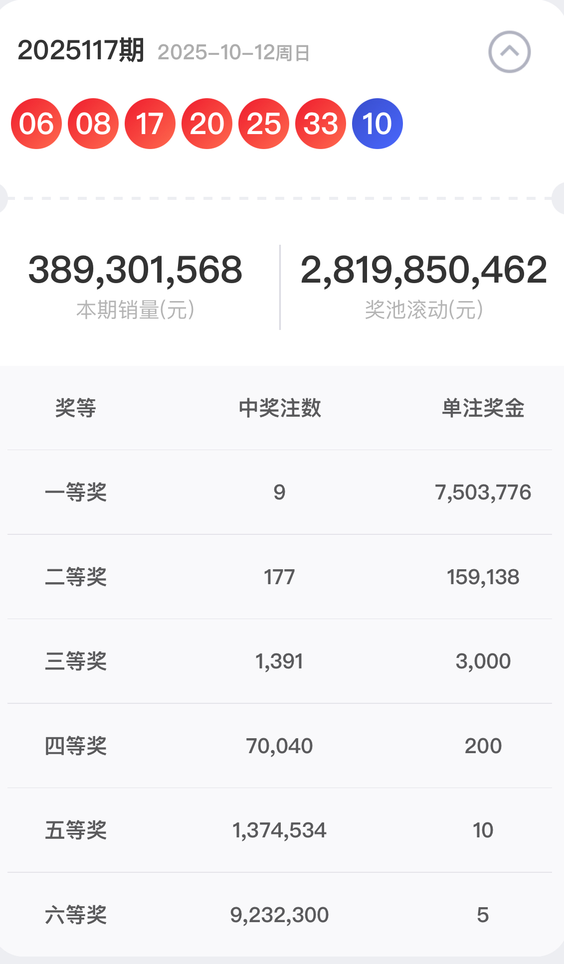 中国福利彩票双色球游戏②⓪②⑤117期开奖信息