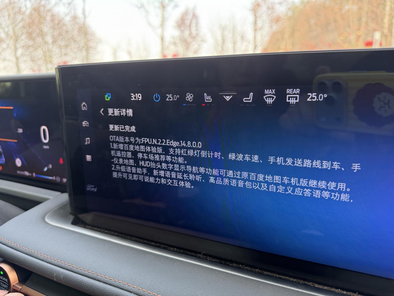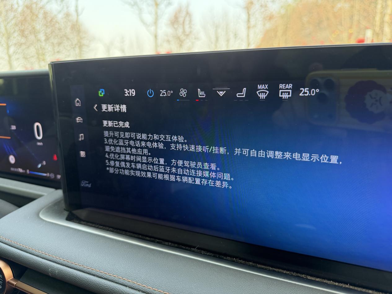 那天手机福特派弹了通知,我就赶紧上车点了更新。过程挺简单的,车停好挂着P档,按照提示一步步来,下载加安装大概用了二十来分钟,期间车子不能开,我就坐车里刷刷手机等着。更完了说实话,让我有种“常用常新”的感觉,就像手机系统偶尔升个级,虽然不会立马惊艳,但用起来总会发现些小惊喜。