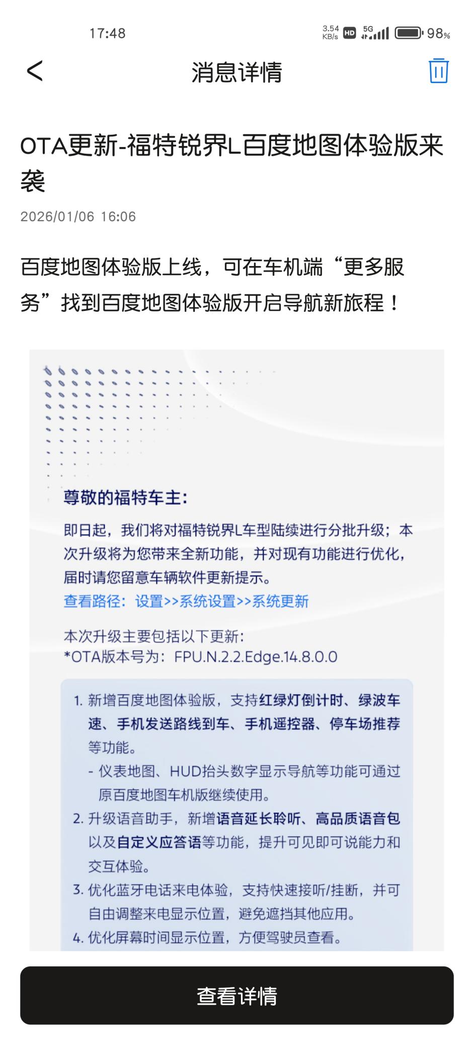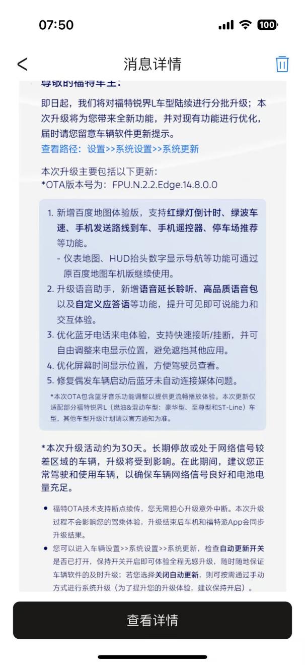 所以当我在福特派上看到推送,说锐界L有OTA更新的时候,心里还是有点小期待的,倒不是指望它能“翻天覆地”,就是觉得厂家还能想起我们这些老车主,给车机添点新花样,这态度就挺暖心的。更新是分批次推送的,我看群里有的车友早收到了,我的稍晚几天,但总会轮到,这不就如期来了嘛。
