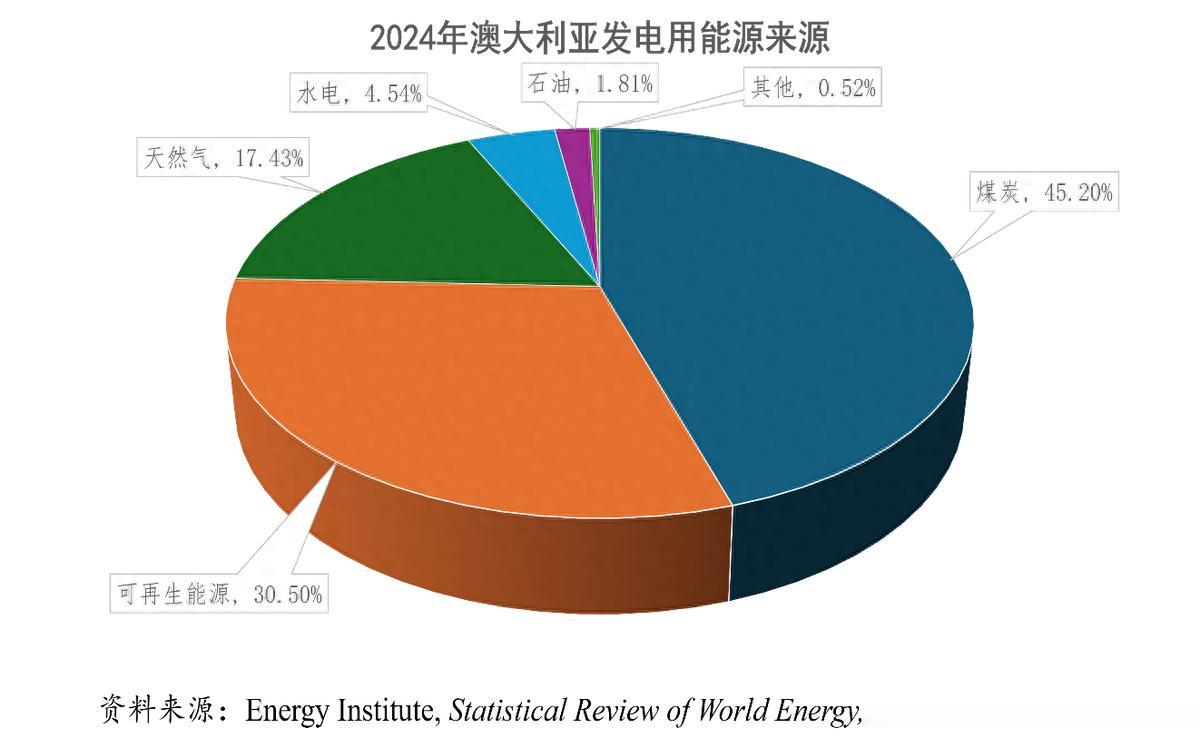 位于南半球的澳大利亚,拥有丰富的能源资源,是国际能源市场中的大国。2022年之前,澳大利亚一直是世界最大的煤炭出口国,2021年出口的煤炭占全球煤炭出口总量的28.68%。2020-2022年的三年里,澳大利亚是世界最大的液化天然气出口国。澳大利亚国内的能源消费,尤其是发电用能源来源,高度依赖以煤炭为主的化石燃料,2024年煤炭就占澳大利亚发电用能源来源的45.2%。