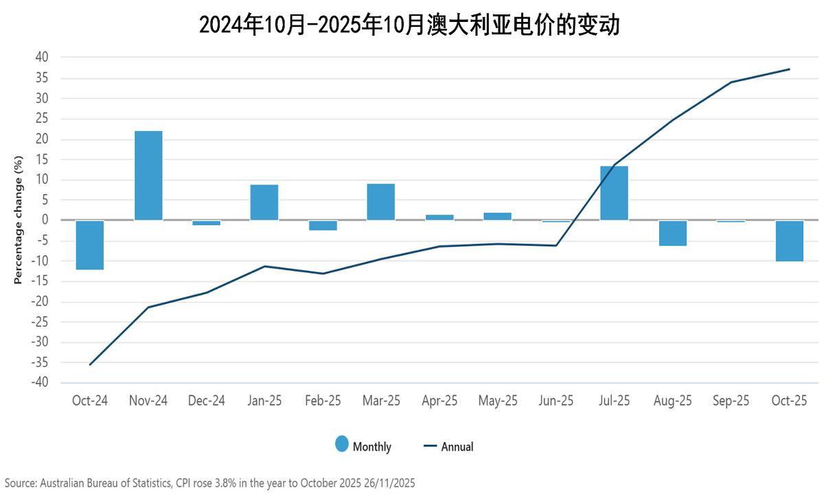 2025年11月26日,澳大利亚统计局发布数字称,在截至2025年10月的12个月内,澳大利亚的CPI上涨了3.8%。其中,在截至10月份的12个月中,电力成本上涨了37.1%,高于9月份的33.9%。