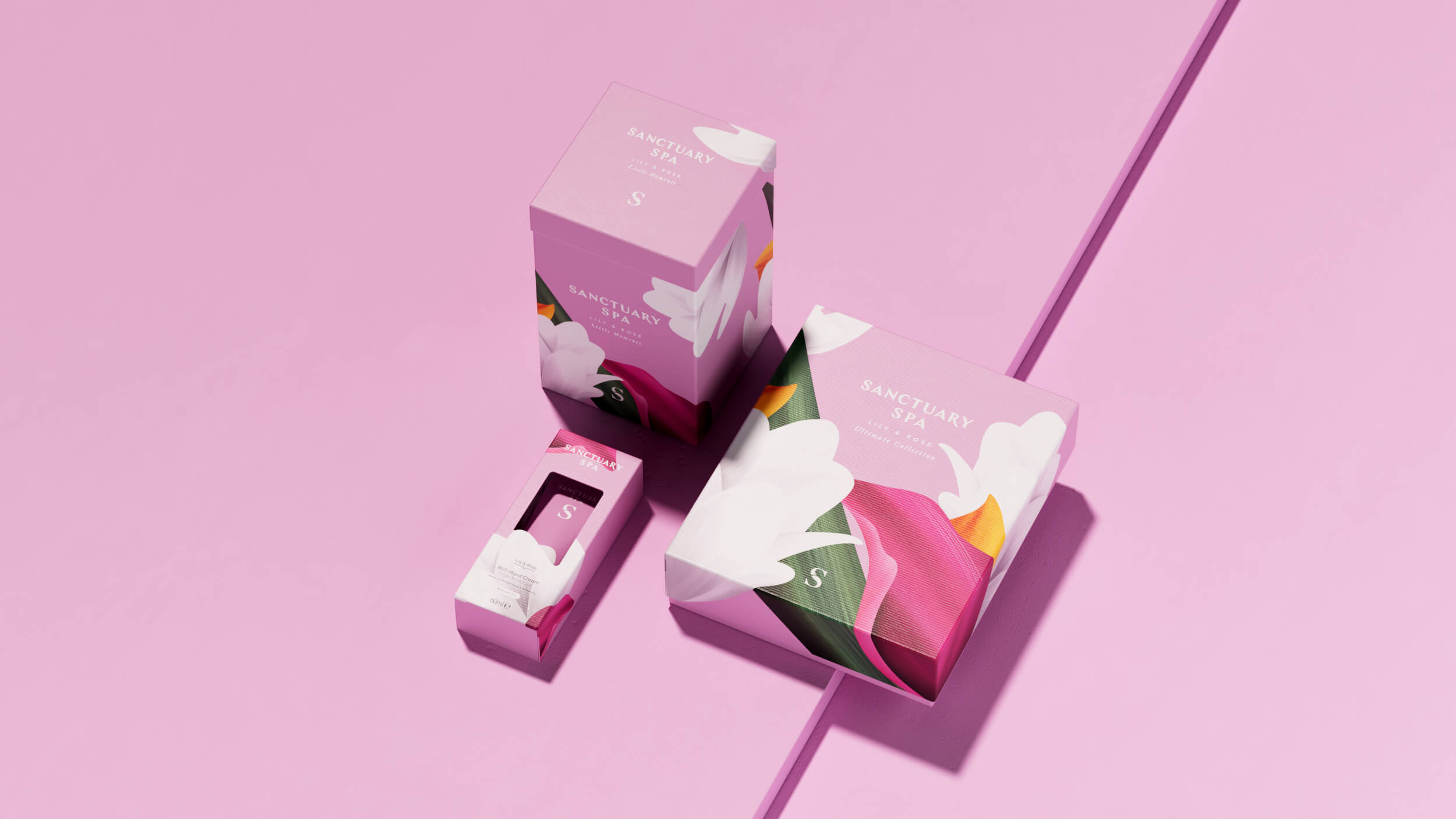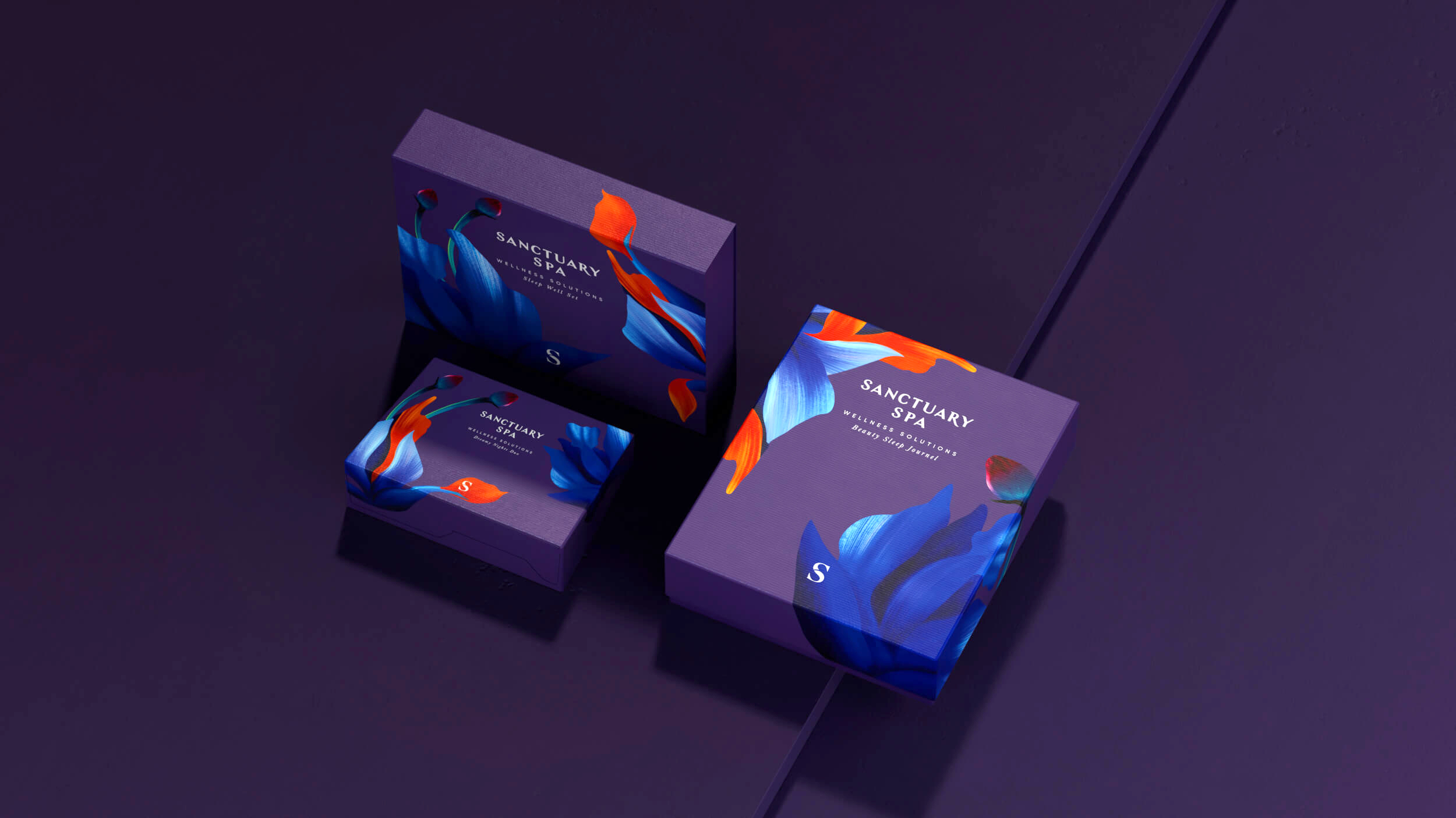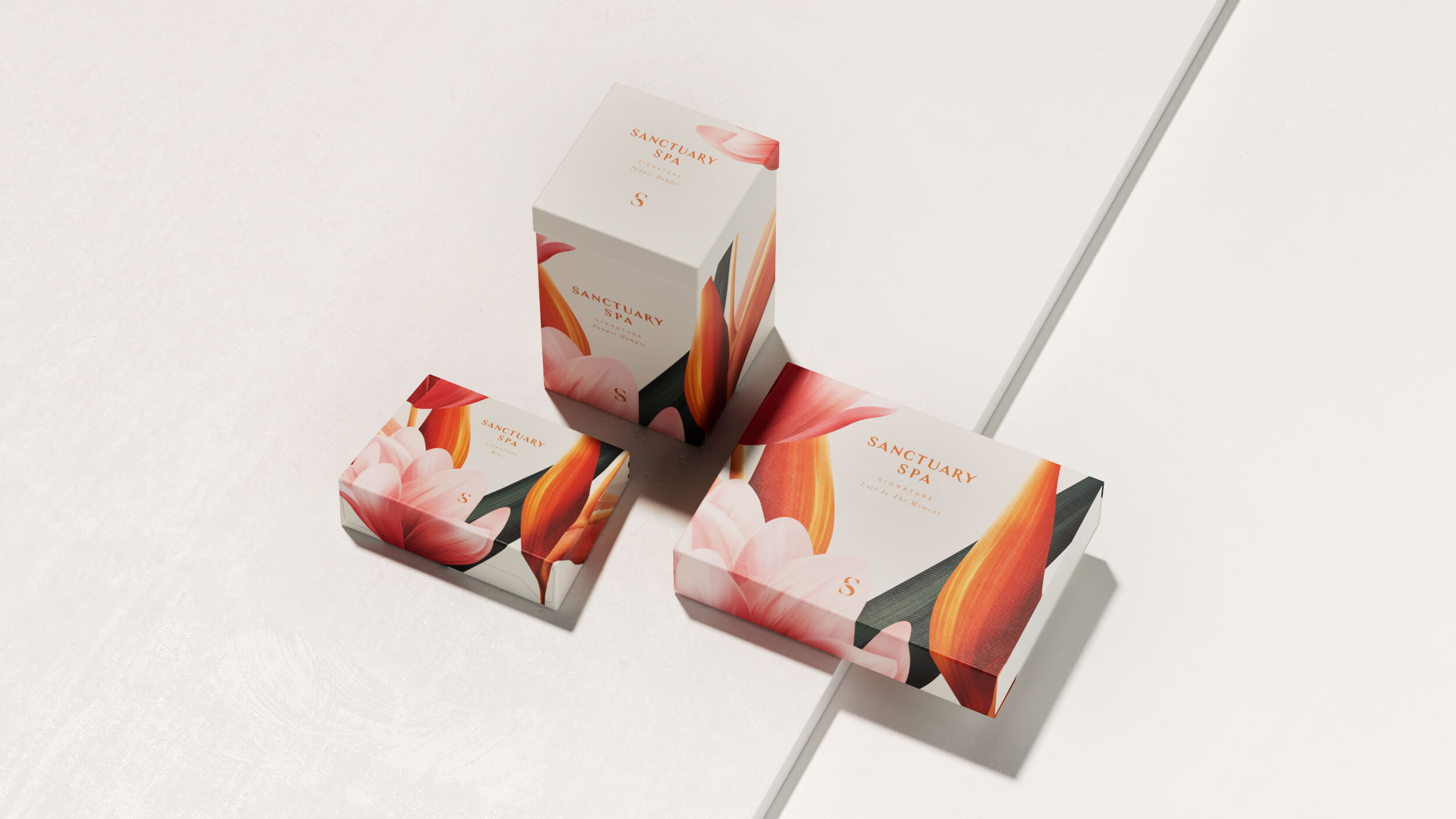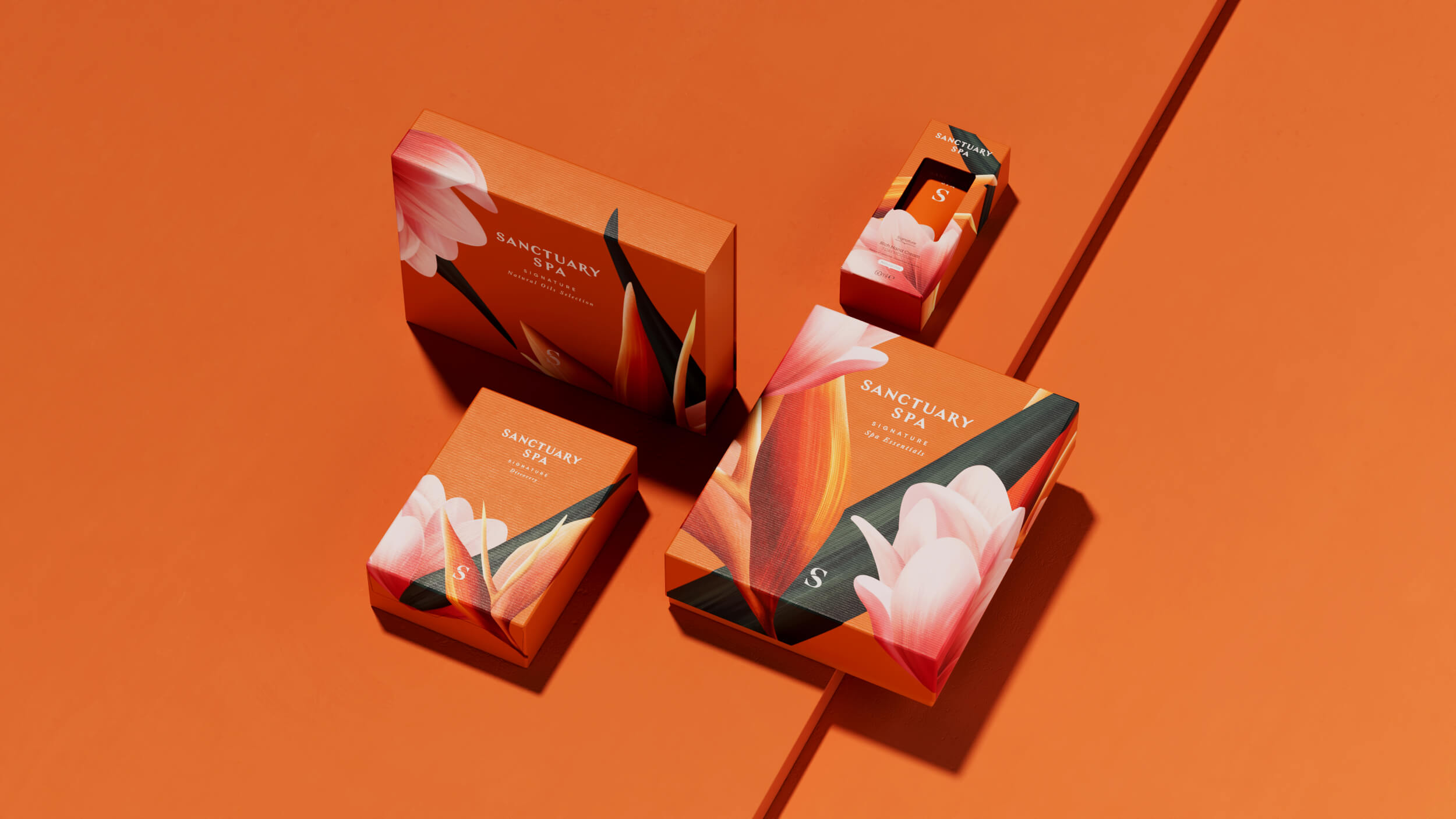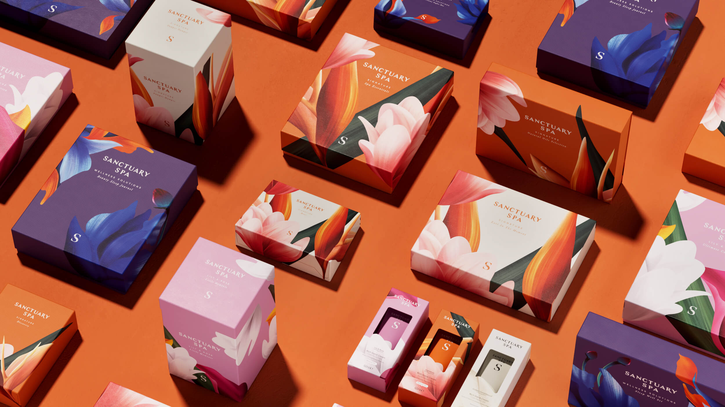 你看过会开花的包装吗?Sanctuary Spa的包装设计就像把热带花园直接搬到了盒子上。鲜艳的橙色、粉色和紫色背景上,盛开着充满艺术感的花朵,仿佛在告诉你:“快来享受一场奢华的SPA之旅吧!”每个包装都像是一幅精美的画作,让人忍不住想要收藏。无论是大盒还是小盒,都充满了视觉冲击力,让人一眼就爱上。