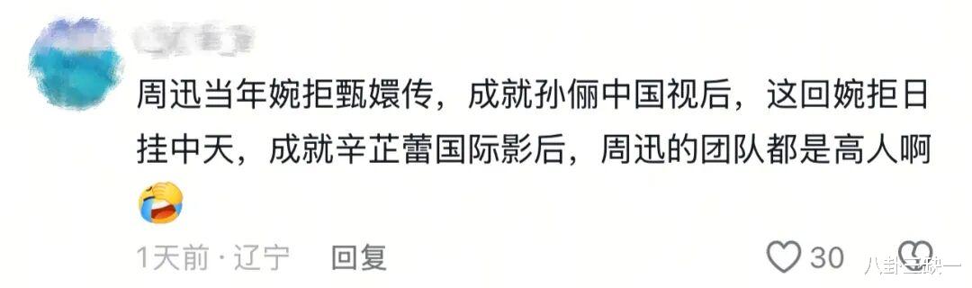起初,还只是些“替周迅可惜”的论调,感慨她团队决策失误,错过《甄嬛传》就算了(郑晓龙曾公开表示过本来《甄嬛传》想找周迅演,阴差阳错以为她不演电视剧了就没联系),《日掛中天》这颗“国际遗珠”也没把握住。