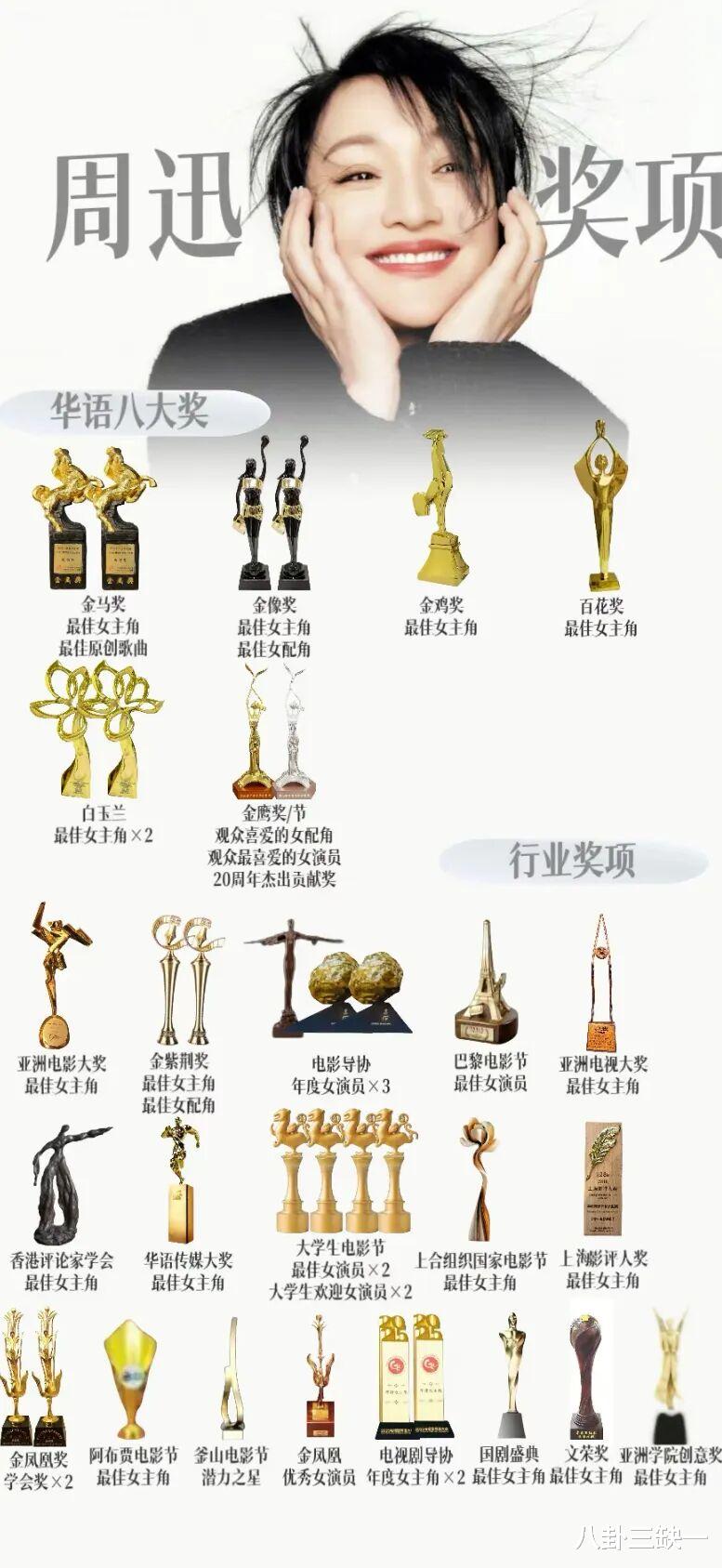 退一步说,就算有人觉得她某部戏的表演没达到预期,也不能否认周迅在华语影视圈的地位。作为华语电影史上罕见的“大满贯影后”,周迅手里握着香港电影金像奖、台湾电影金马奖、大众电影百花奖、亚洲电影大奖...几乎拿遍了华语影坛所有重要奖项。