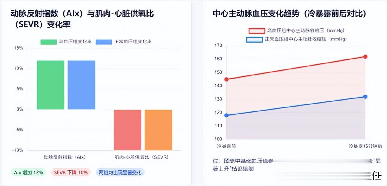 临床上我们发现,低温刺激会引起交感神经亢奋,血管随之收缩、阻力上升,因此血压会出现明显波动。比如,一项涉及 51 名未经治疗的高血压者与 32 名正常血压者的实验,在–10 °C 冷暴露 15 分钟后,中心主动脉血压显著上升,动脉反射指数(AIx)增加了 12%,而肌肉-心脏供氧比(SEVR)下降了 10%。