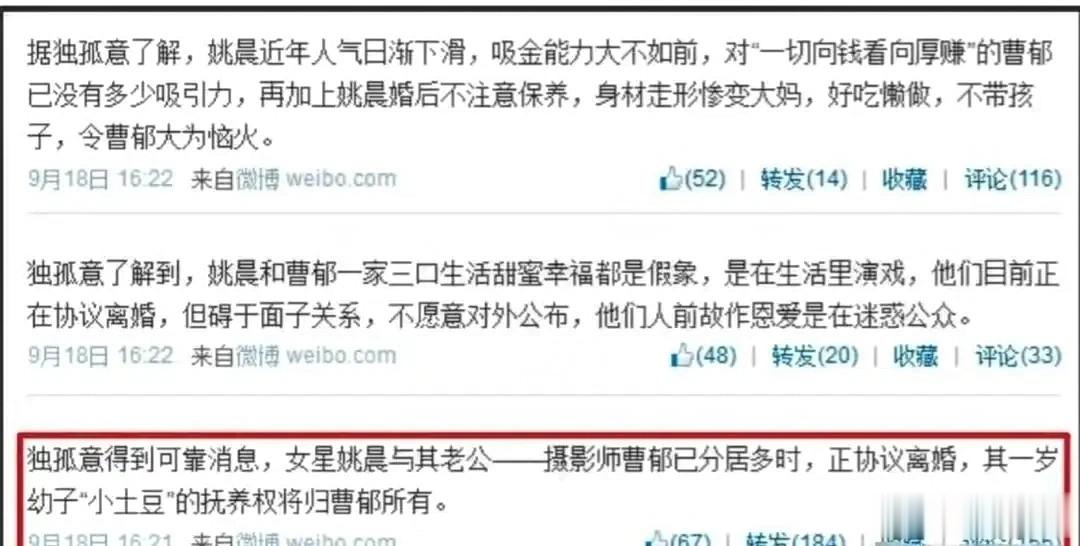 这些爆料里,有旧闻、有猜测、有恶意编造,真正有官方实锤的,只有姚晨和曹郁和平离婚这一件事。