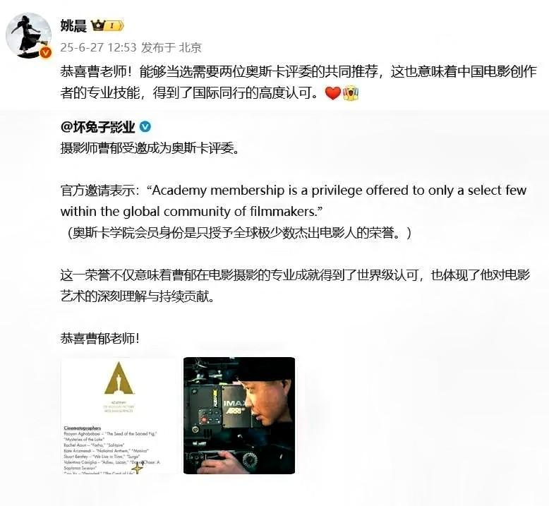 曹郁是不错的摄影师,拿过专业奖项,但国民度和事业高度,跟姚晨真的没法比。