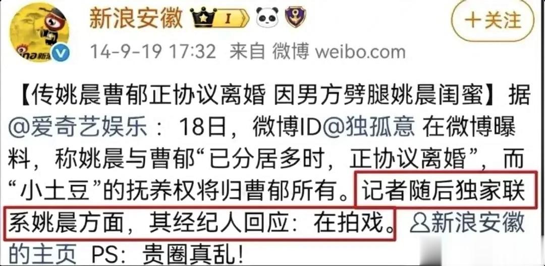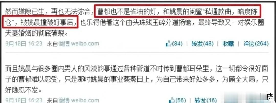 旧闻重提:曹郁出轨闺蜜?第一个被扒烂的,就是12年前的老料。有网友翻出博主“独孤意”的爆料,说曹郁出轨了姚晨的闺蜜,两人早就分居闹离婚。