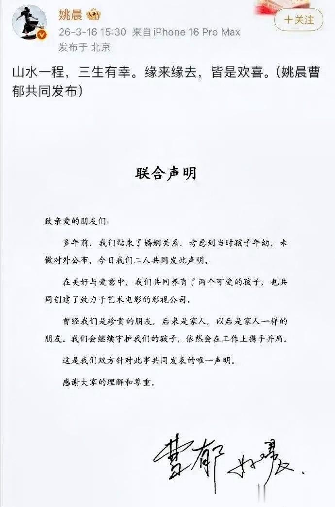 1. 姚晨、曹郁离婚联合声明:2026年3月16日新浪娱乐官方报道