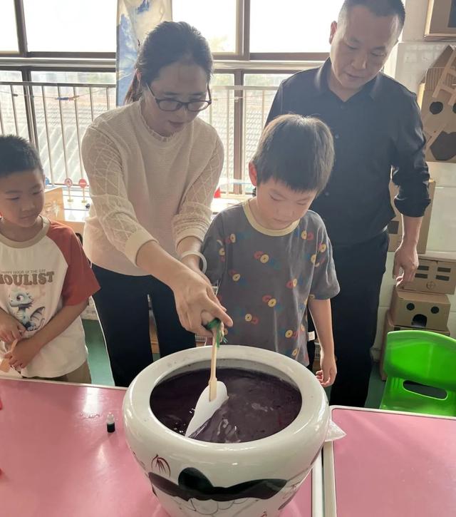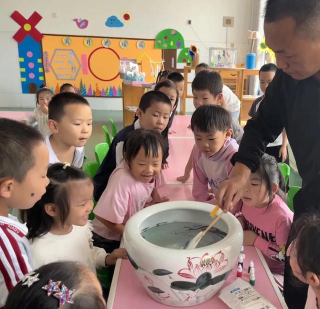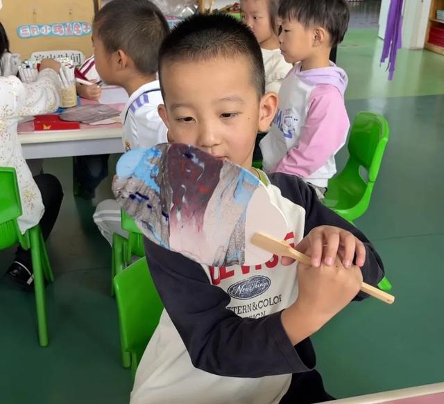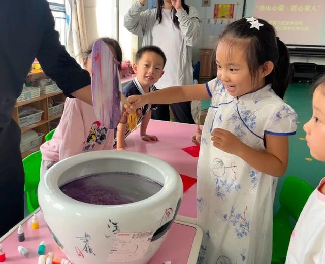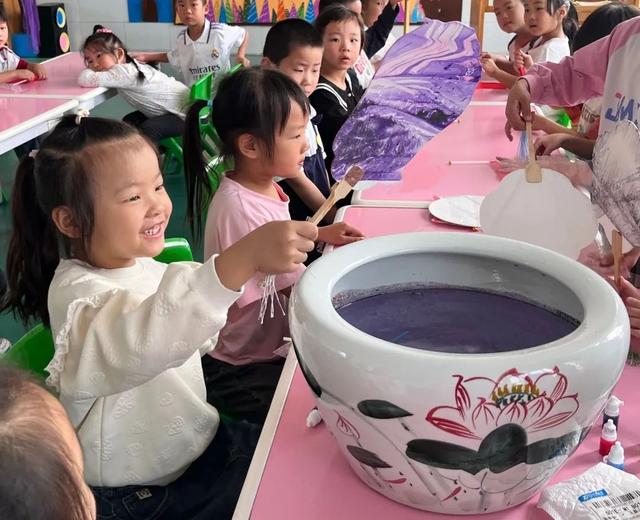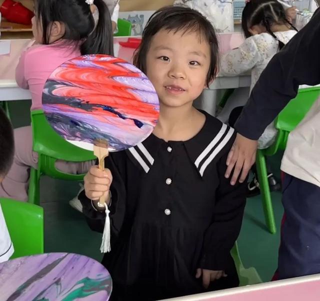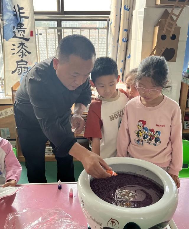 唐斌杰与孩子们一起制作漆扇,从调色到上色再到涤干水分,手把手讲解制作技艺,激发幼儿的动手能力和创造力,感受中国传统文化的瑰丽和精致,以及古人对美的追求和审美情趣。