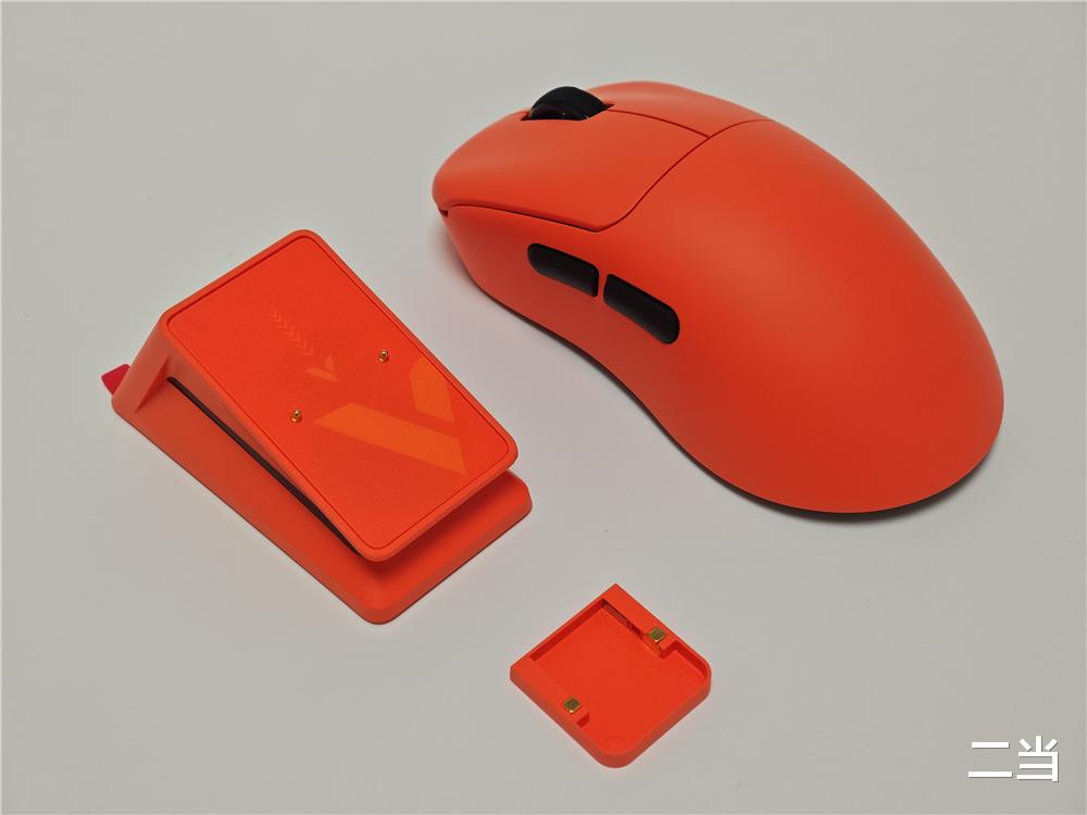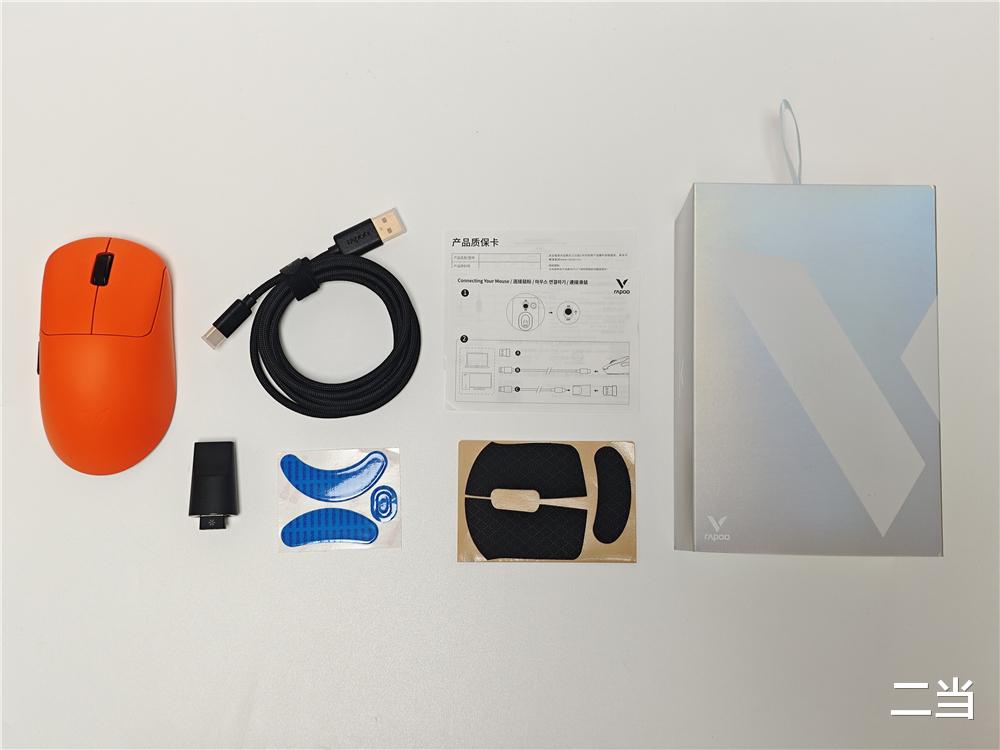 包装方面延续前几代产品镭射电竞风格,配件有一根黑色数据线、一个8K接收器、一个USB转接器、一套脚贴和一套防滑贴。