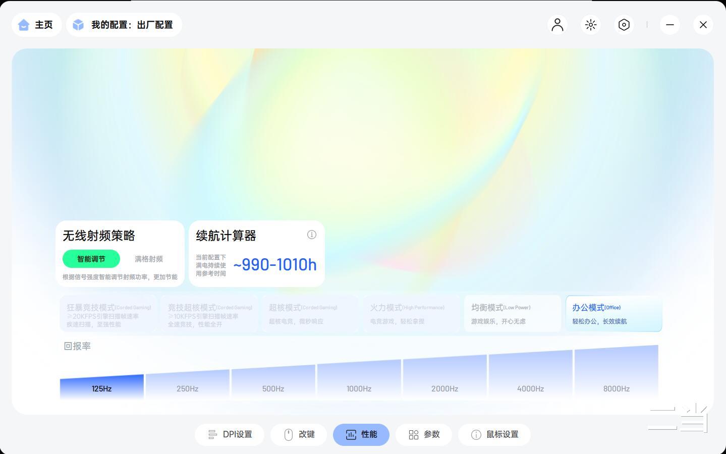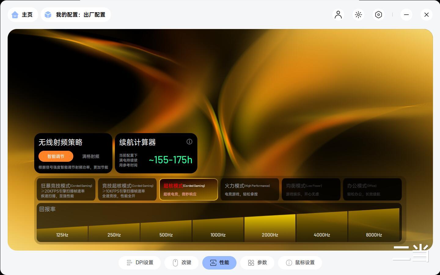 雷柏VT3s原相3398电竞级定制引擎(高定版3395),支持50-26000 DPI灵敏度调节,650IPS追踪速度、50G加速度,支持11档LOD静默高度可调(1.0–2.0mm),通过支持驱动支持狂暴竞技模式、竞技超核模式 、超核模式、火力模式、均衡模式、办公模式可选。