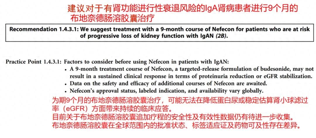 新版指南推荐,对于有肾功能进行性衰退风险的IgA肾病患者,进行9个月的布地奈德肠溶胶囊的治疗,明确了布地奈德肠溶胶囊的一线用药地位。