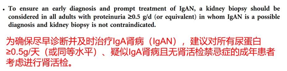 在诊断时机方面,新版指南明确指出,对于尿蛋白达到或超过0.5g/天(或同等水平)、临床怀疑为IgA肾病且没有肾活检禁忌症的成年患者,应当进行肾活检以明确诊断。