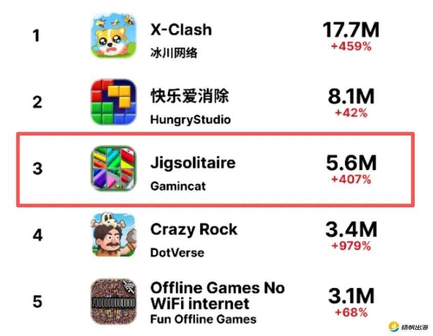 另一款值得关注的产品是《Jigsolitaire》,这是一款由日本游戏公司Gamincat发行,今年3月上线的益智拼图游戏,和《X-Clash》类似的是,这款游戏也是在10月迎来了自己的高光时刻。刚上线时,《Jigsolitaire》仅在美国iOS免费游戏榜中昙花一现,随后便很快跌落至500名左右,但自9月起,这款产品的排名突然开始上涨,10月正式登顶美国iOS免费榜并霸榜长达6天,此外,还登上了多达34个国家及地区的iOS免费游戏榜榜首。根据AppMagic,该游戏10月下载量涨幅高达407%,单月总下载量达到5.6M,已经逼近Hungry Studio常年霸榜的《快乐爱消除》(该游戏10月下载量为8.1M),堪称休闲品类赛道中的一匹黑马。