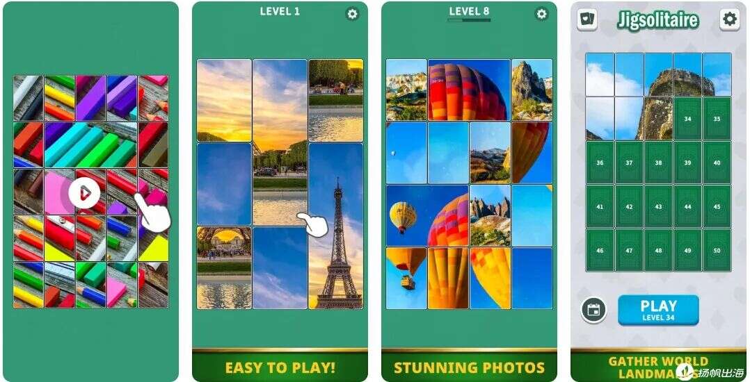 《Jigsolitaire》正如其名,是Jigsaw Puzzle(拼图)和Solitaire(纸牌接龙)的融合产物,其核心玩法是卡牌拼图,整体采用关卡的模式,随着难度推进,卡牌碎片也会增多,每当碎片挪动到正确的位置就会连成一片,减少玩家操作步骤的同时也极大降低了游戏难度。另外,由于是滑动操作,体感上也有几分华容道游戏的影子,所以游戏的受众非常广泛。
