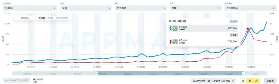 其中,冰川网络的SLG新游《X-Clash》是这个榜单上表现最亮眼的产品之一。过去,冰川网络主要布局的是卡牌、放置等赛道,我们最熟悉的产品是《X-Hero》和《Hero Clash》,但《X-Clash》的出现,意味着冰川网络也开始加码对休闲SLG的投入。作为其新产品线中首款已上线产品,《X-Clash》自8月11号上线(部分国家及地区6月便已上线)以来表现一直比较平缓,直到10月才迎来爆发:10月22日登顶墨西哥游戏总榜第一,巴西、美国休闲游戏榜TOP1,根据AppMagic的估算,其10月25日单日下载量可能就已经达到了176万次,创下历史新高,与此同时收入也逐步攀升,同日下载量约达到8万美元。而在整个10月份,该游戏的总下载量和总流水预计分别为2220万和1300万元。