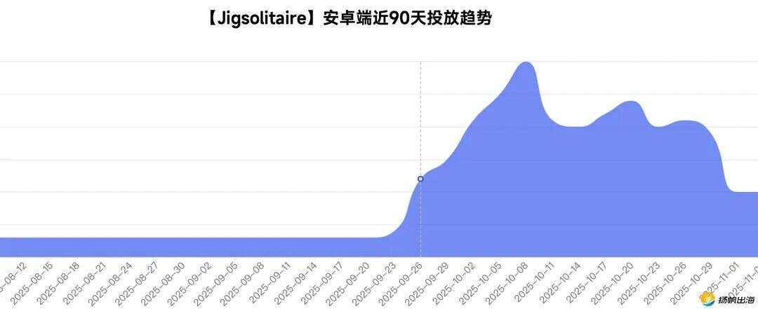 不过,根据商店评论,该游戏的差评也比较集中在游戏难度低、过于简单,希望游戏推出更有挑战性的关卡。从其几次版本更新内容看,《Jigsolitaire》并未对“连成一片”这一游戏机制和关卡难度做出调整,根据广大大,该游戏从9月下旬开始加大投放力度,在10月达到投放巅峰,其买量力度和下载增长走势基本一致,所以基本可以判断是买量因素。