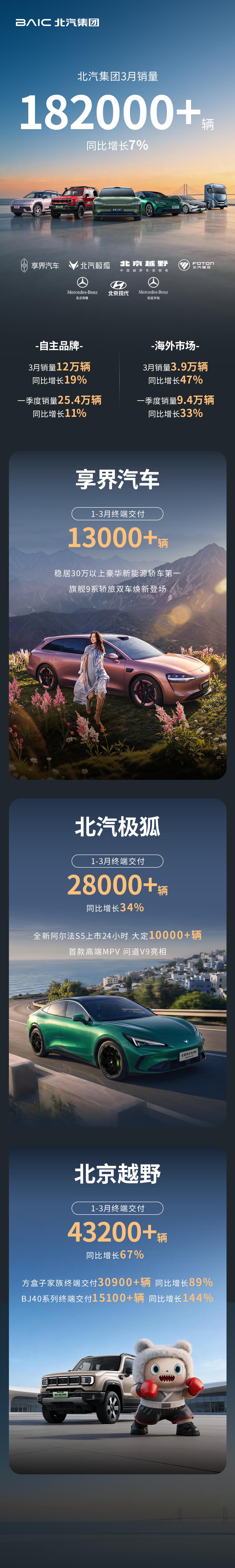 4 月 4 日消息,4 月 4 日(今天)午间,北汽集团发布销量快报:3 月销量超过 18.2 万辆,同比增长 7%。