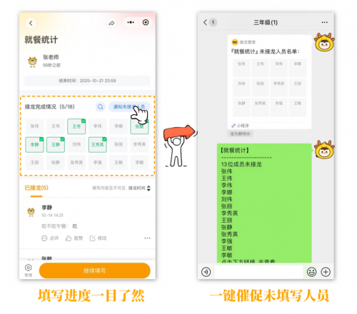 完成后只需将接龙转发到班级群,家长点击链接即可参与接龙,如需更改用餐需求,家长直接修改接龙即可,不用反复打扰老师。