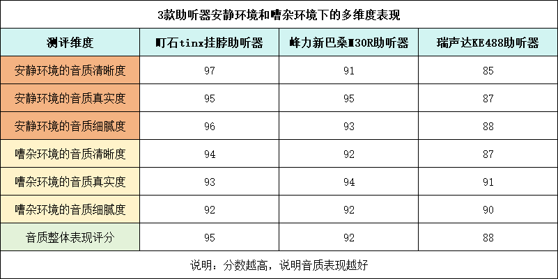 测评方法:本次音质实测,我将分别在安静和嘈杂环境中佩戴助听器,然后观察助听器音质清晰度、音质真实度和音质细腻度表现,并对三款助听器的整体音质表现进行打分。